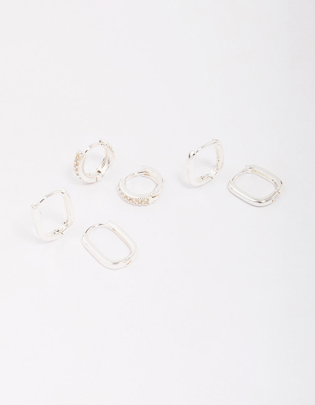 Create the stack of your dreams with this set of silver plated brass hoops. This earring pack includes three sets of geometric huggies, perfect for layering together in your daily rotation.