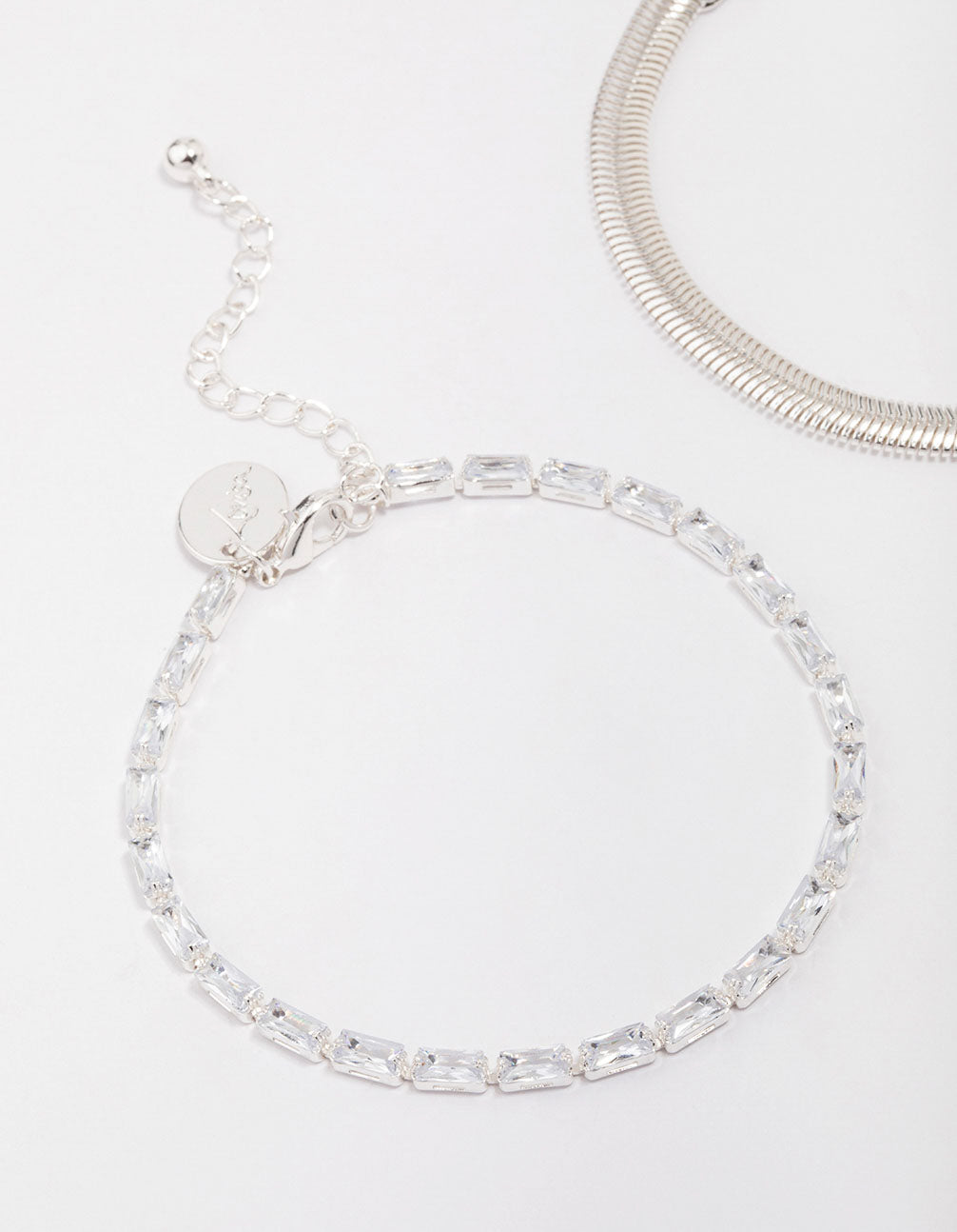 For a signature finish to your look, style this silver plated bracelet pack. This bracelet duo contains a simple, genuine silver snake chain and layered baguette bracelet. Perfect for styling together or solo in your wrist stack!