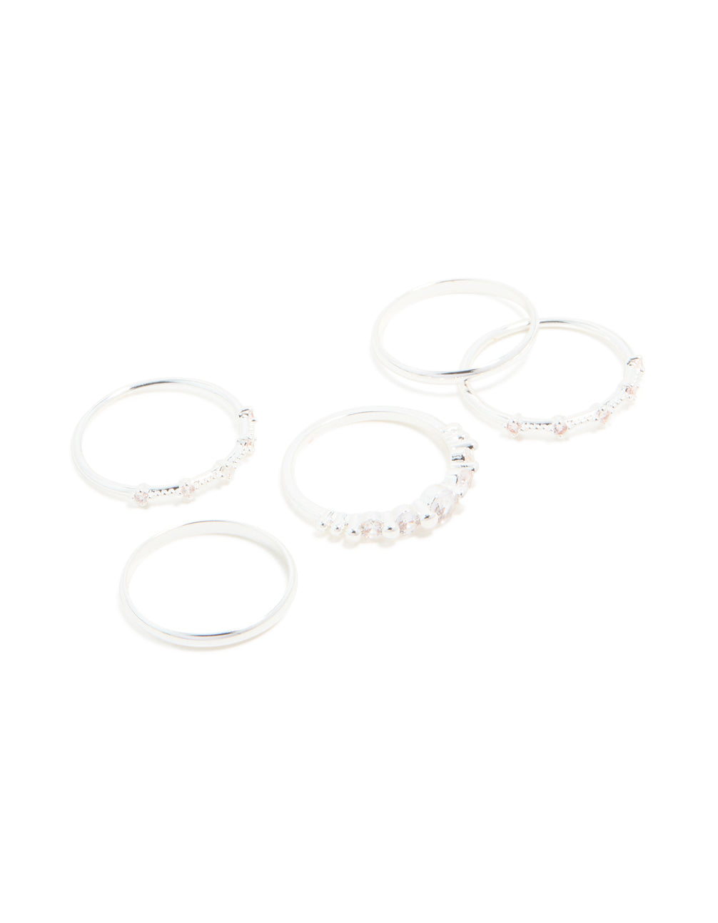 Elevate your accessory game with this Silver Plated Dainty Cubic Zirconia Stacking Rings Pack. This versatile jewellery set includes five stunning rings: two sleek, smooth bands, a playful silver ball ring with pink cubic zirconia crystals, and two chic bands featuring five pink cubic zirconia crystals spaced elegantly across. Perfect for stacking or wearing solo, these silver-plated beauties add a touch of shimmer to any outfit. Whether you're dressing up for a night out or keeping it casual with your favourite jeans and tee, these rings are the perfect finishing touch. Lightweight and stylish, they’re ideal for everyday wear or special occasions. Mix, match, and stack to create your own unique look!