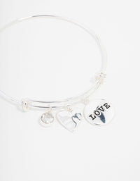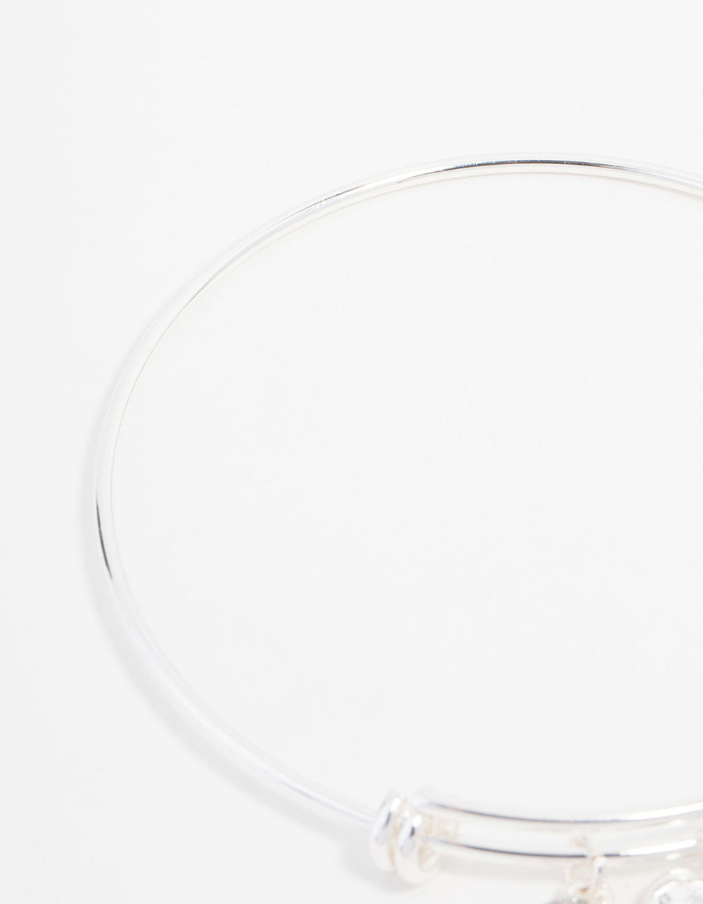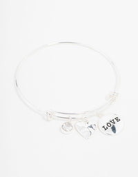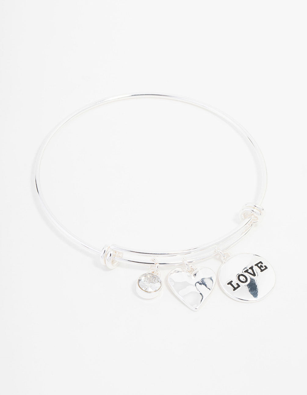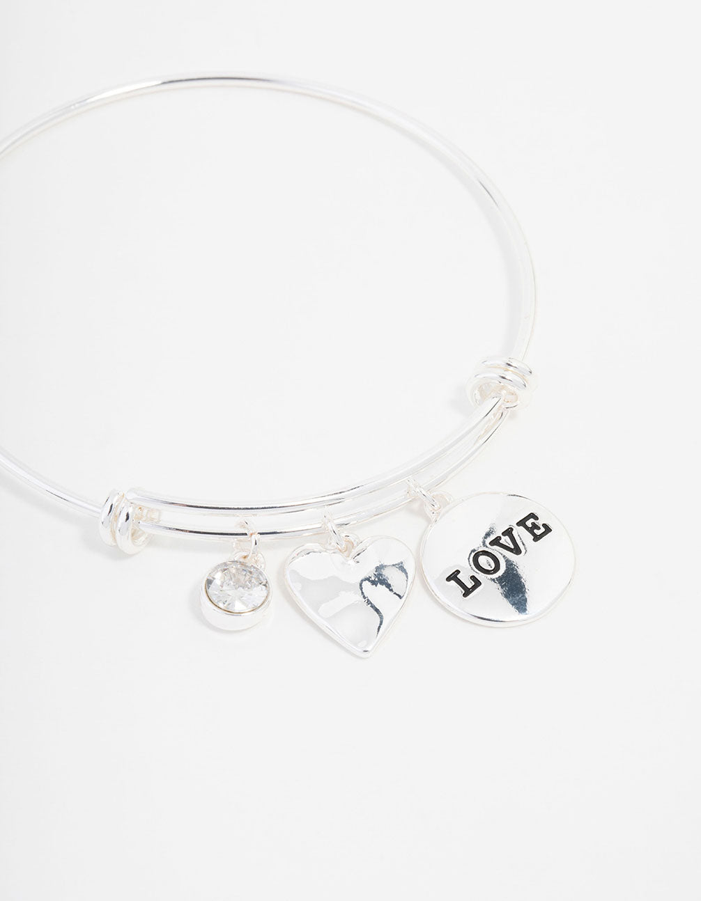 Get ready to embrace all things love with this adorable Silver Plated Disc Charm Bangle. This delightful, dainty bracelet is packed with charming details like a shiny silver heart, a love inscribed circle and a sparkling gem charm.