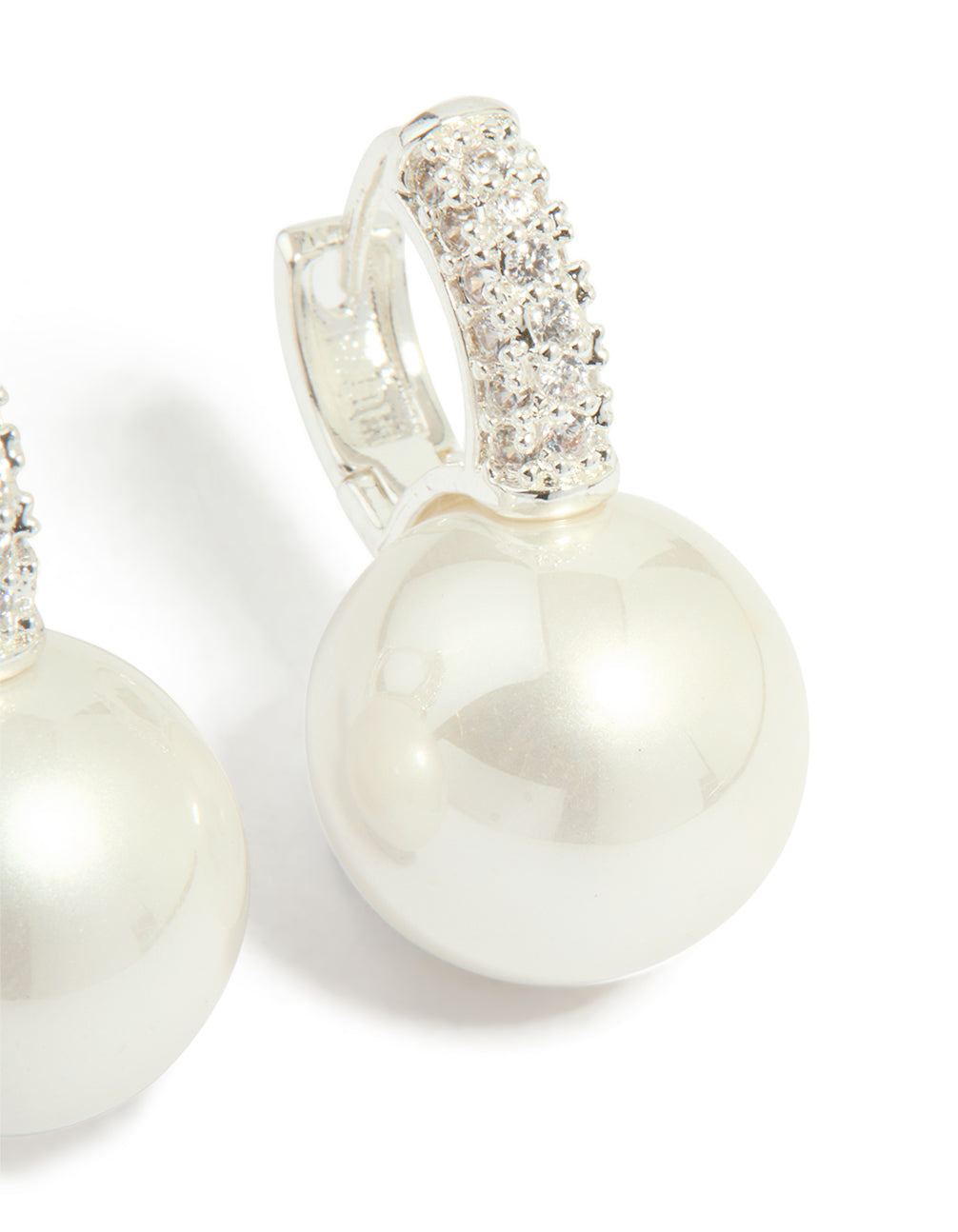 Silver Plated Large Pearl Drop Cubic Zirconia Huggie Earrings
