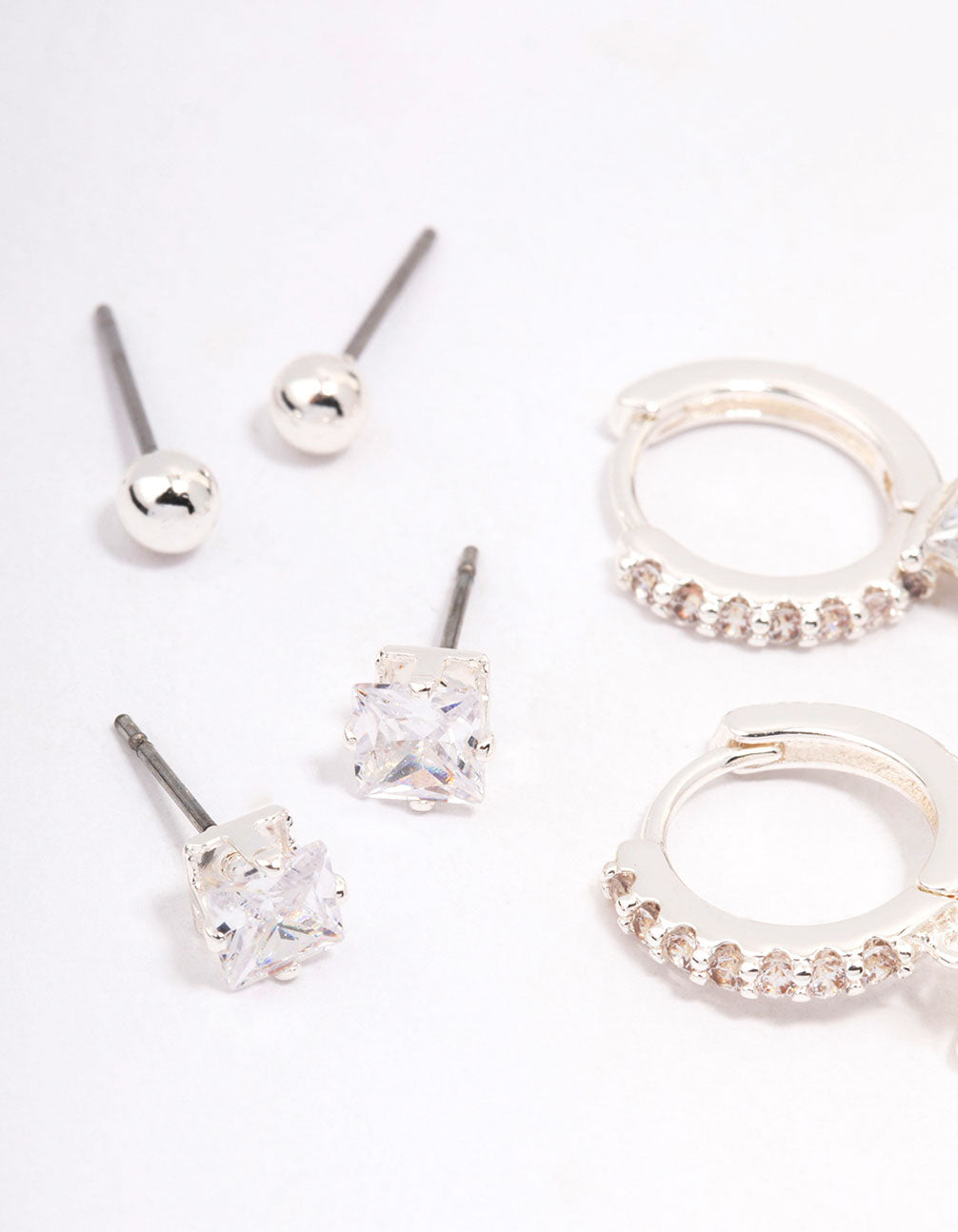Elevate your stack with this set of four, silver plated huggie hoops. This earring pack includes four pairs of mixed stud and huggie hoop earrings, each encrusted with cubic zirocnia crystals for a touch of sparkle.
