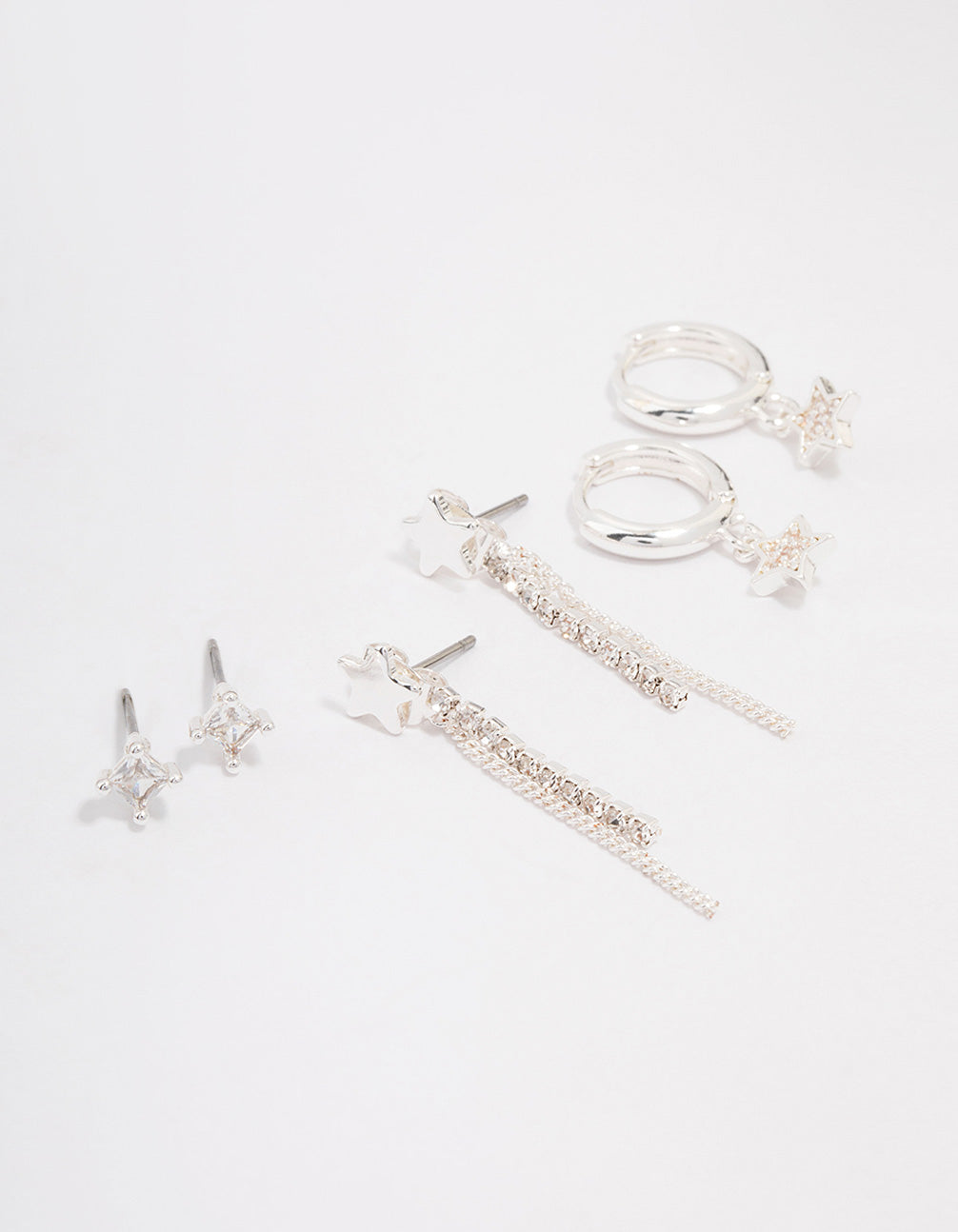 This set of earrings includes three pairs of real silver huggie hoops and studs, perfect for styling together or solo in your stack.