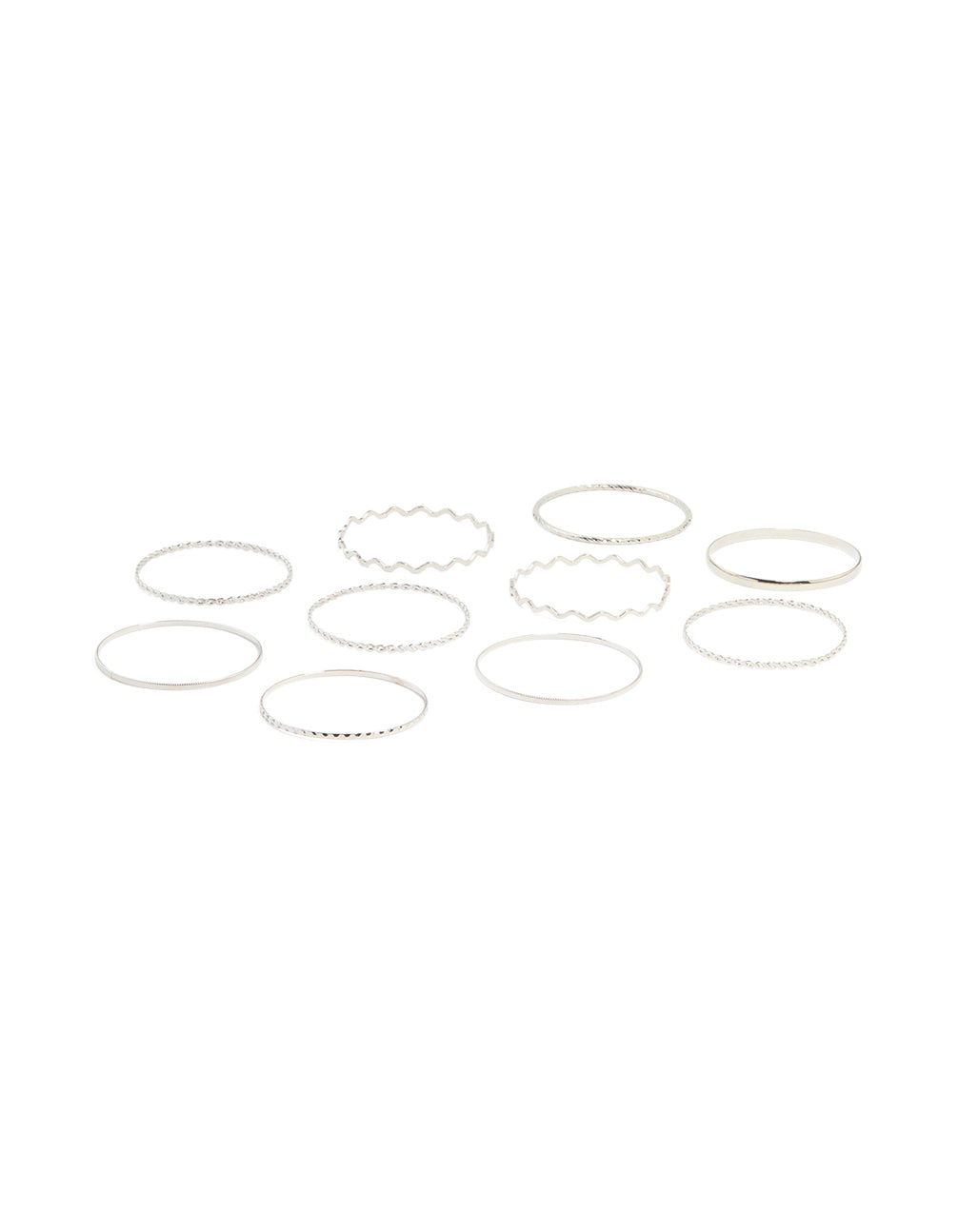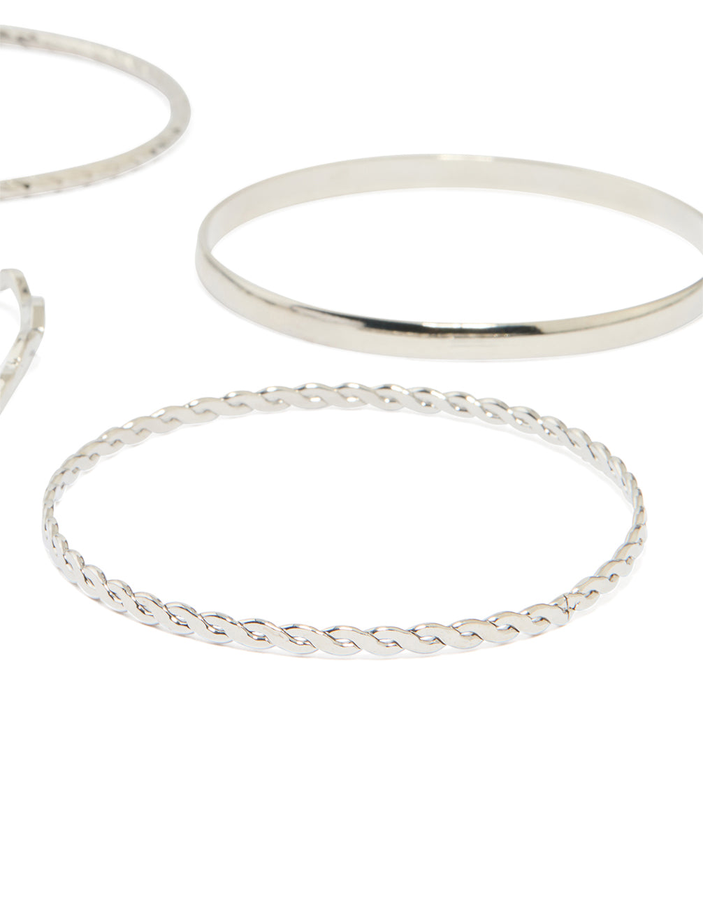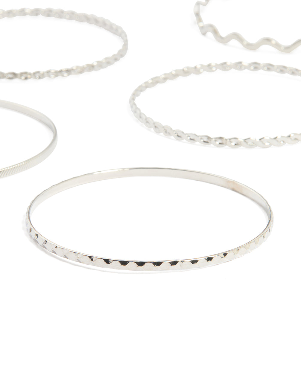 Stack up the style with this Silver Rope & Textured Bangles Pack. This bangle pack includes a mix of thin ribbed bangles, molten textured designs, twisted rope bangles, wavy shapes, and one smooth bangle, all crafted in a polished silver-tone finish. Whether you're dressing up for a night out or adding flair to your everyday outfits, this variety pack has you covered. Perfect for layering or wearing solo, these bangles let you mix and match to suit your mood. Pair them with a flowing maxi dress for boho vibes or a tailored blazer for a sleek, modern look. Lightweight yet eye-catching, this jewellery set is ideal for everything from brunch dates to evening events.