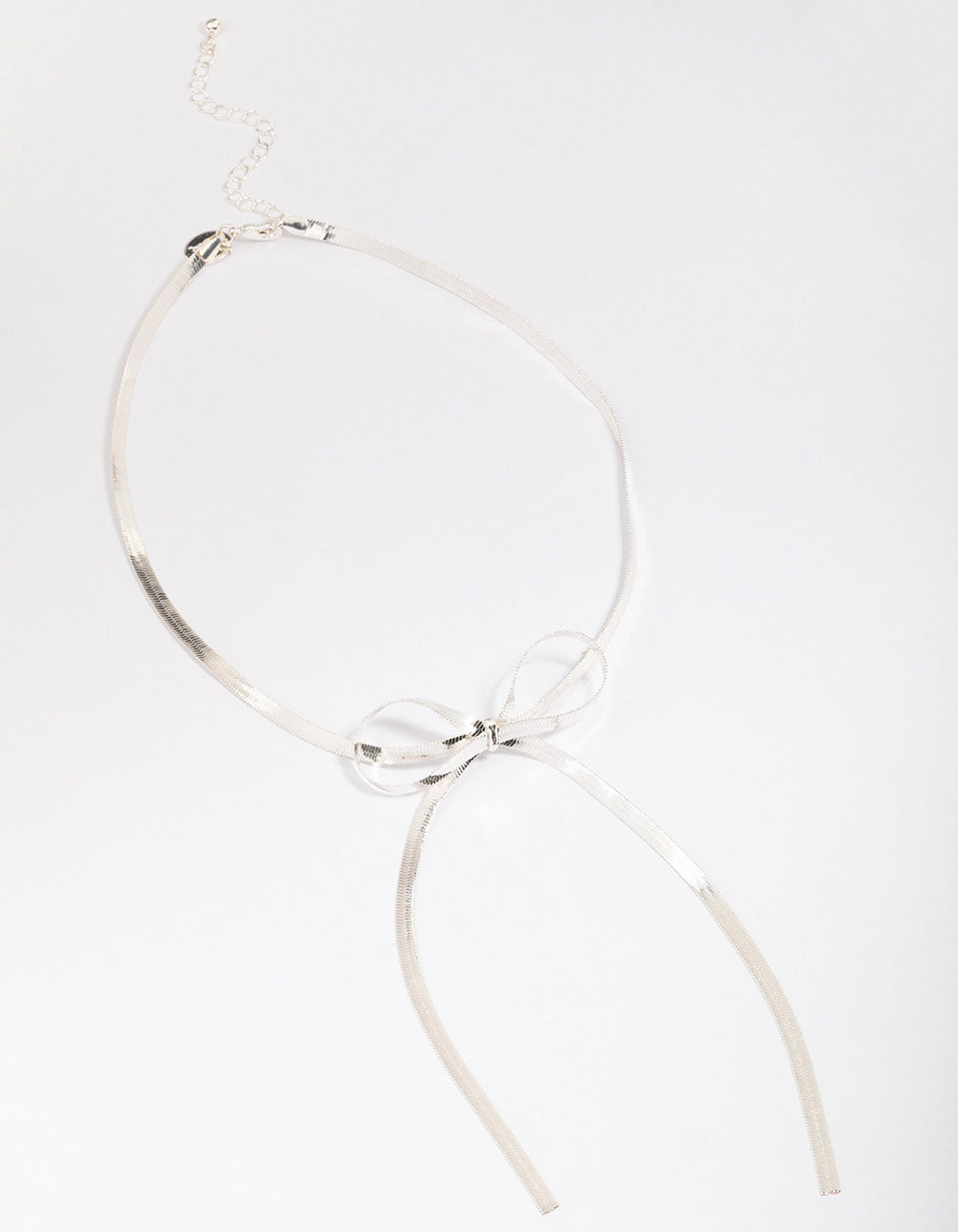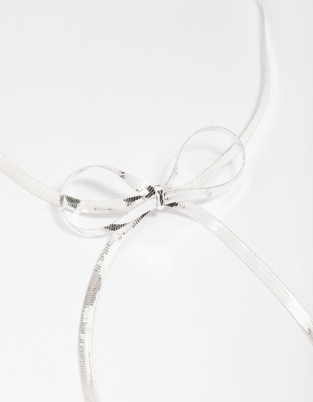 This chain necklace features a stunning, silver-toned setting designed in the shape of a bow.