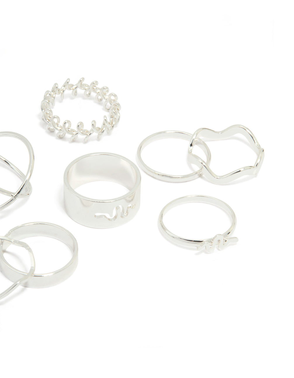 Add some edge to your accessory collection with this Silver Snake & Wavy Rings Pack. This stunning set of stacking rings features a mix of sleek silver-tone designs, including snake-shaped rings, wavy bands, a twisted ring, and a chic crossover style. Perfect for layering or wearing solo, these versatile rings are ideal for creating a bold, personalised look. Whether you're heading to brunch with friends, a festival, or a night out, these rings add a trendy touch to any outfit. Pair them with casual denim or a sleek black dress for effortless style. A must-have jewellery set for anyone who loves to mix and match their accessories!