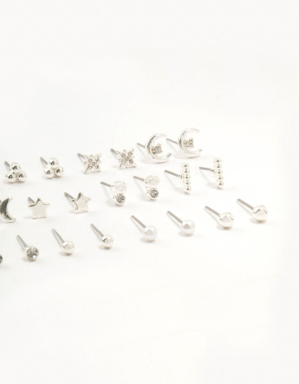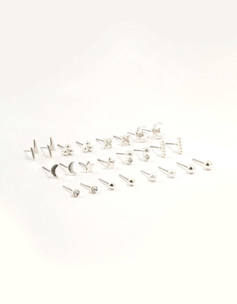 Create a celestial-themed ear stack with this 12-pack of silver-toned earrings. Featuring star and moon motifs, this set is ideal for treating yourself or gifting to a stylish friend, adding a subtle touch of cosmic glam to any look.