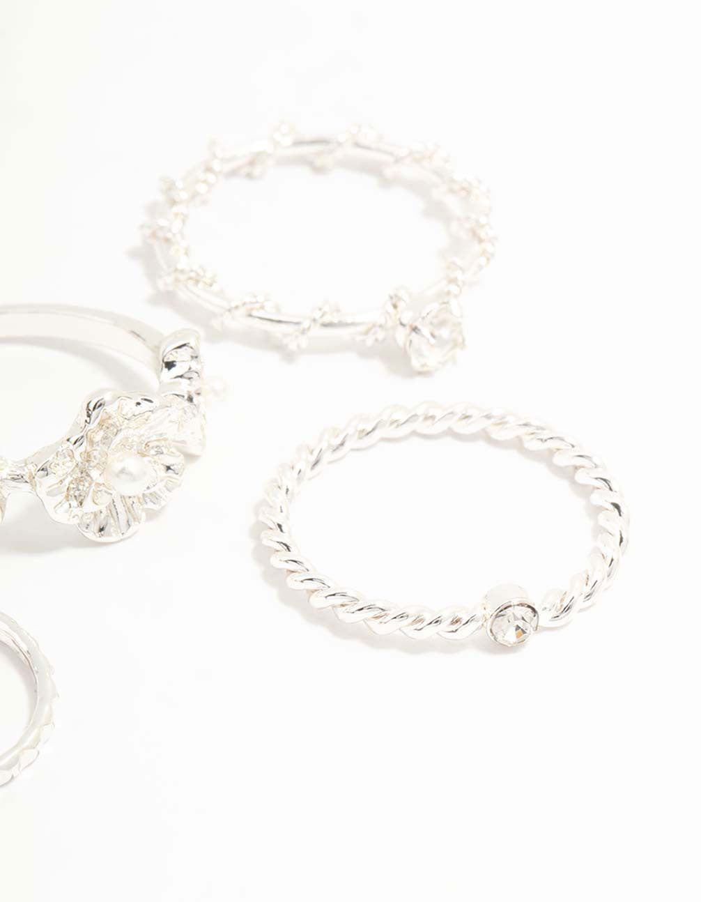 Silver Twisted, Sleek & Diamante Flower Style Rings 5-Pack