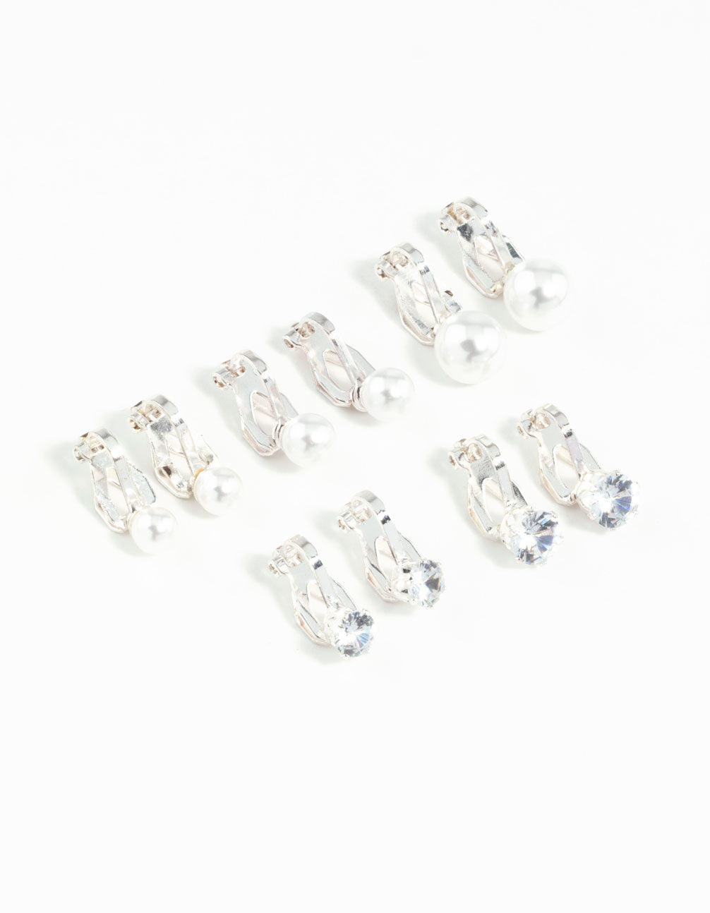 Silver Pearl & Diamante Clip On Earrings 5-Pack