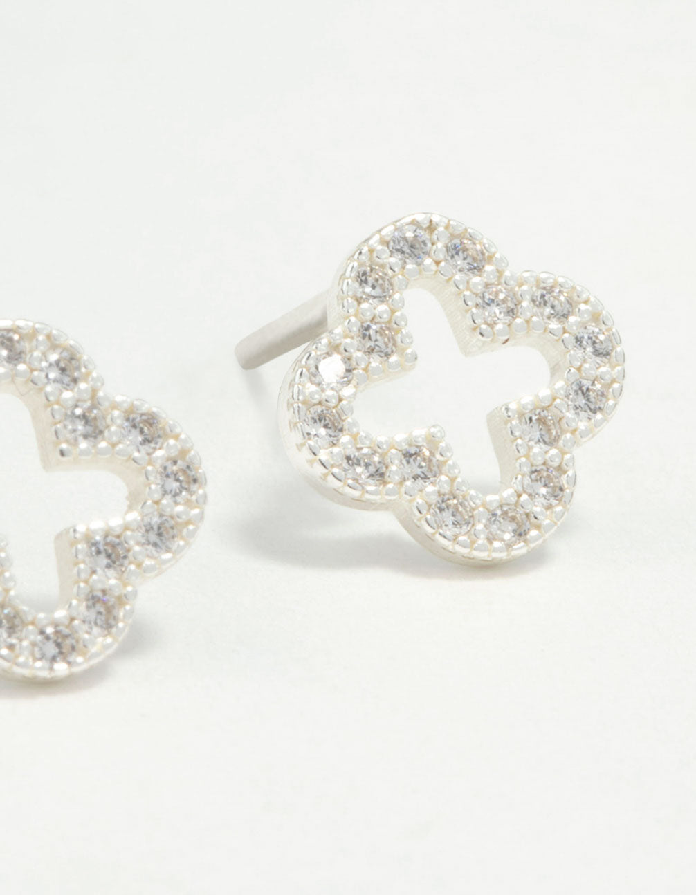 Add luck to any outfit with the Sterling Silver Cubic Zirconia Flower Stud Earrings. These versatile earrings feature delicate clover accents adorned with shimmering cubic zirconia stones, adding a touch of lucky sparkle to your look.