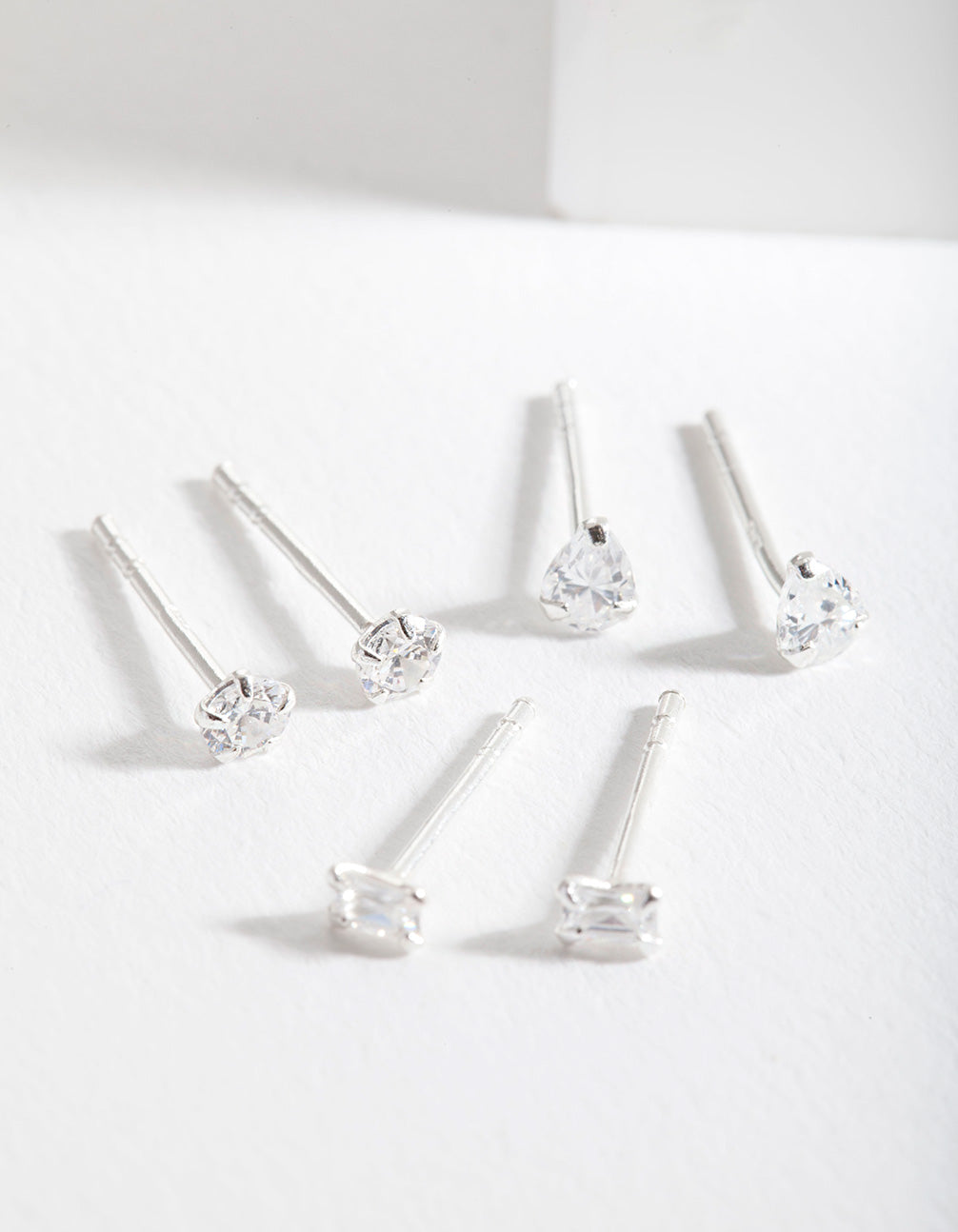 Attract light and shine with classic sterling silver jewellery embellished with cubic zirconia stones. These flawless stones are the perfect way to bring that added bit of sparkle to your collection. This pack comes with a trio of mini stud styles, all featuring different shapes with glittering stones.