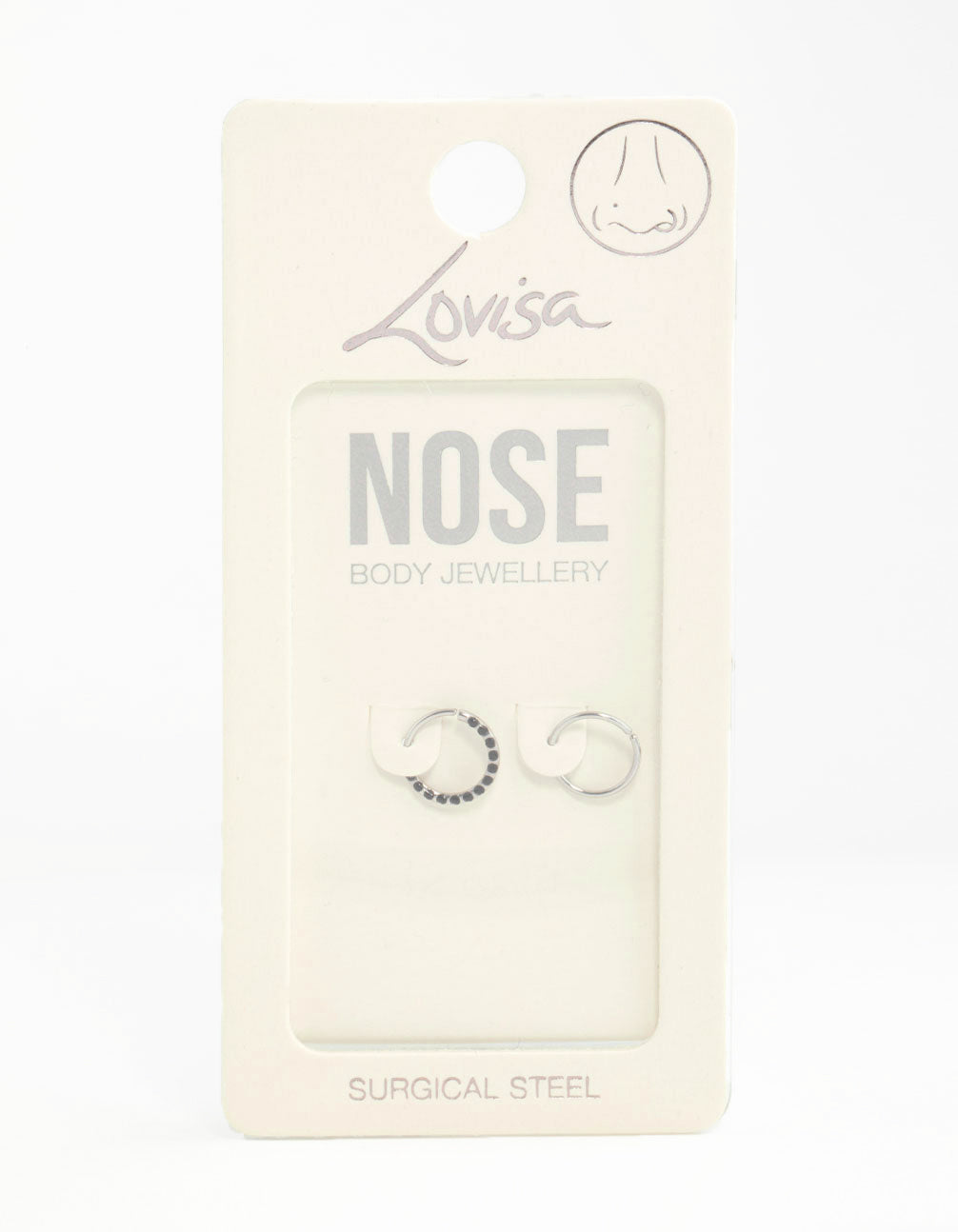 Mix it up! Choose between sleek and textured with this fabulous pack of 2 nose rings. Crafted from sensitive skin-friendly surgical steel, it features a cool black cubic zirconia nose ring and a sleek silver-toned nose ring.