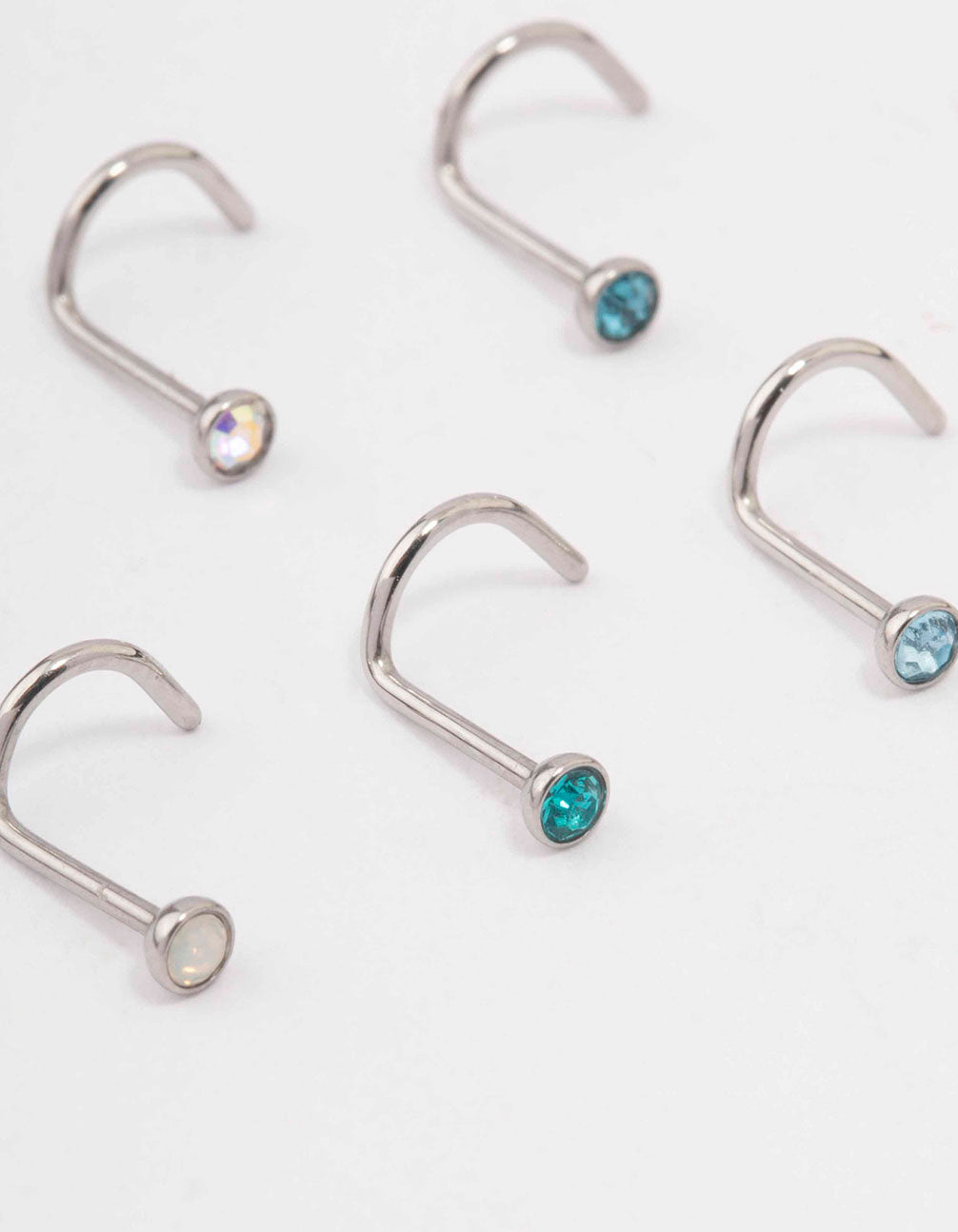 This pack of surgical steel nose piercings contains six individual nose studs, embellished with a mix of blue and crystal gems for a pop of colour.
