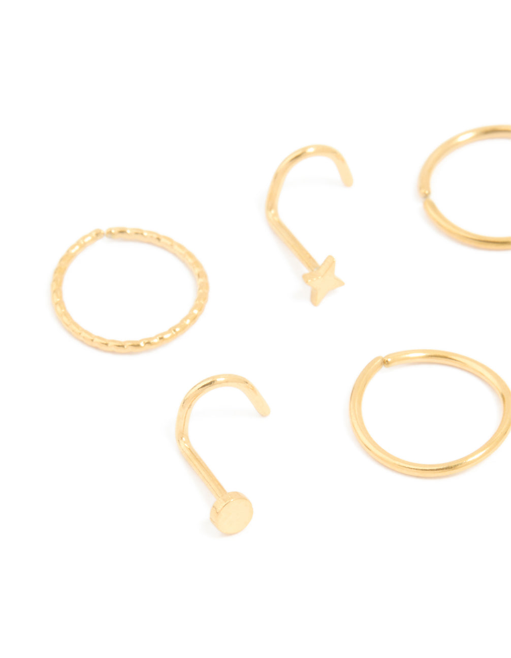 Add a touch of sparkle and style to your look with this Surgical Steel Nose Stud & Ring Pack. Perfect for nose piercings, this versatile set includes a textured nose ring, two smooth nose rings, a star-shaped stud, a flat-front stud, and a cubic zirconia nose stud. Crafted from durable surgical steel, these pieces offer a sleek, modern finish while ensuring comfort and quality.