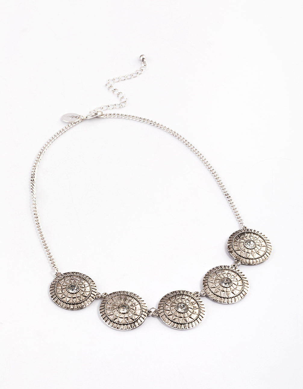 Jewellery staples from our Silver Essentials Collection are perfect for building out your collection! Pair our antique-silver, diamante pattern disc necklace with a pair of cubic zirconia huggie hoops for a hint of sparkle.