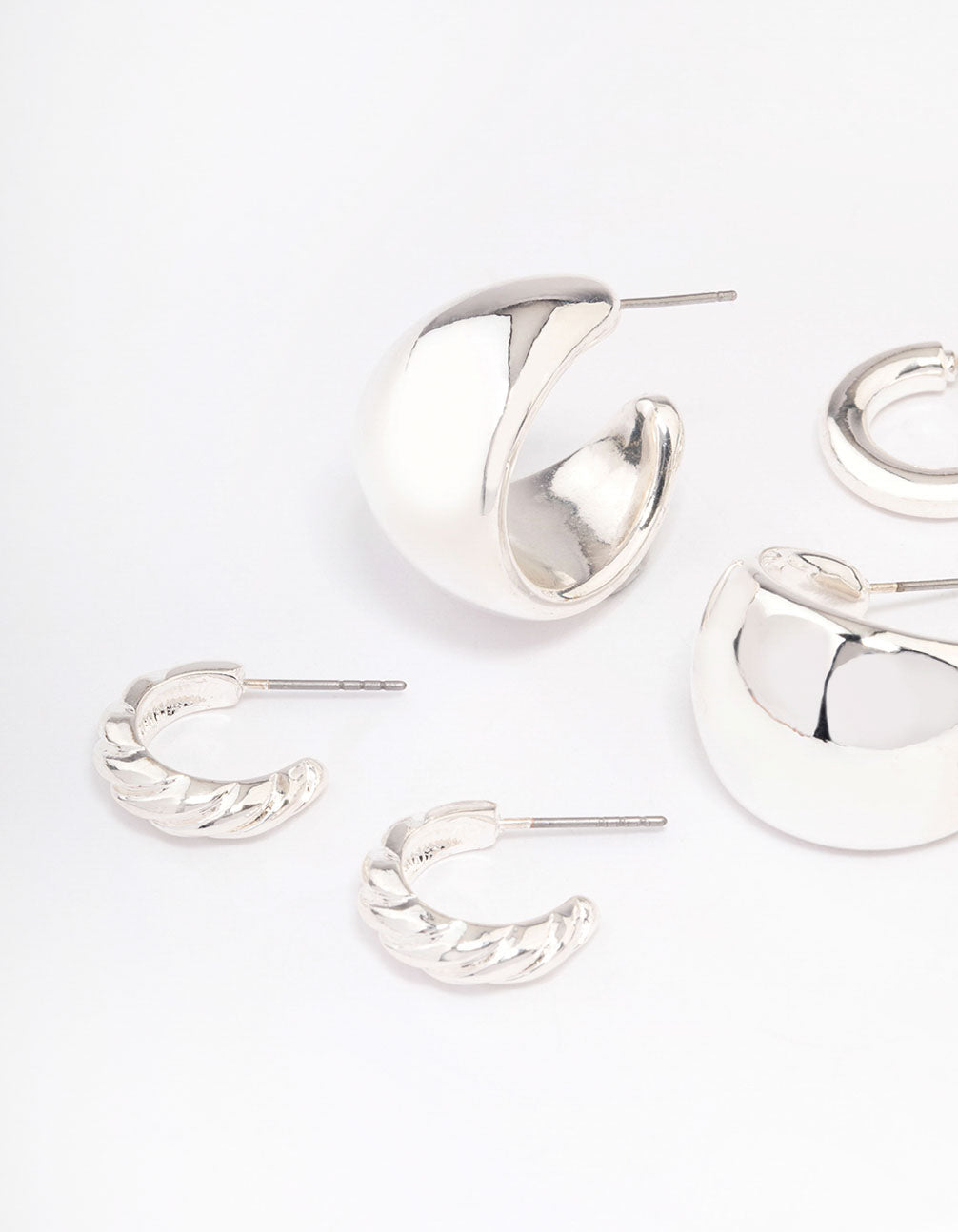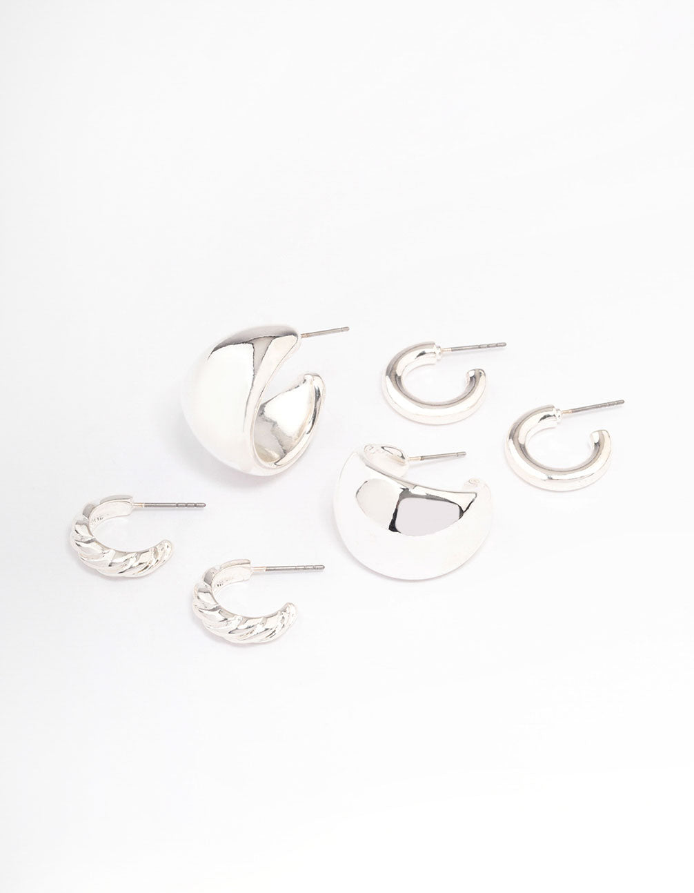 - This pack of silver-toned hoop earrings contains three individual sets of earrings, perfect for styling solo or layered together for a maximalist look.