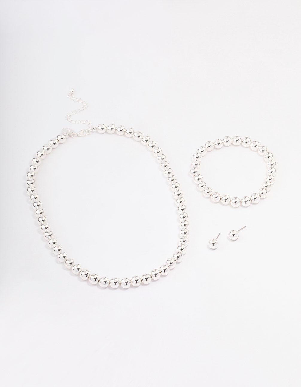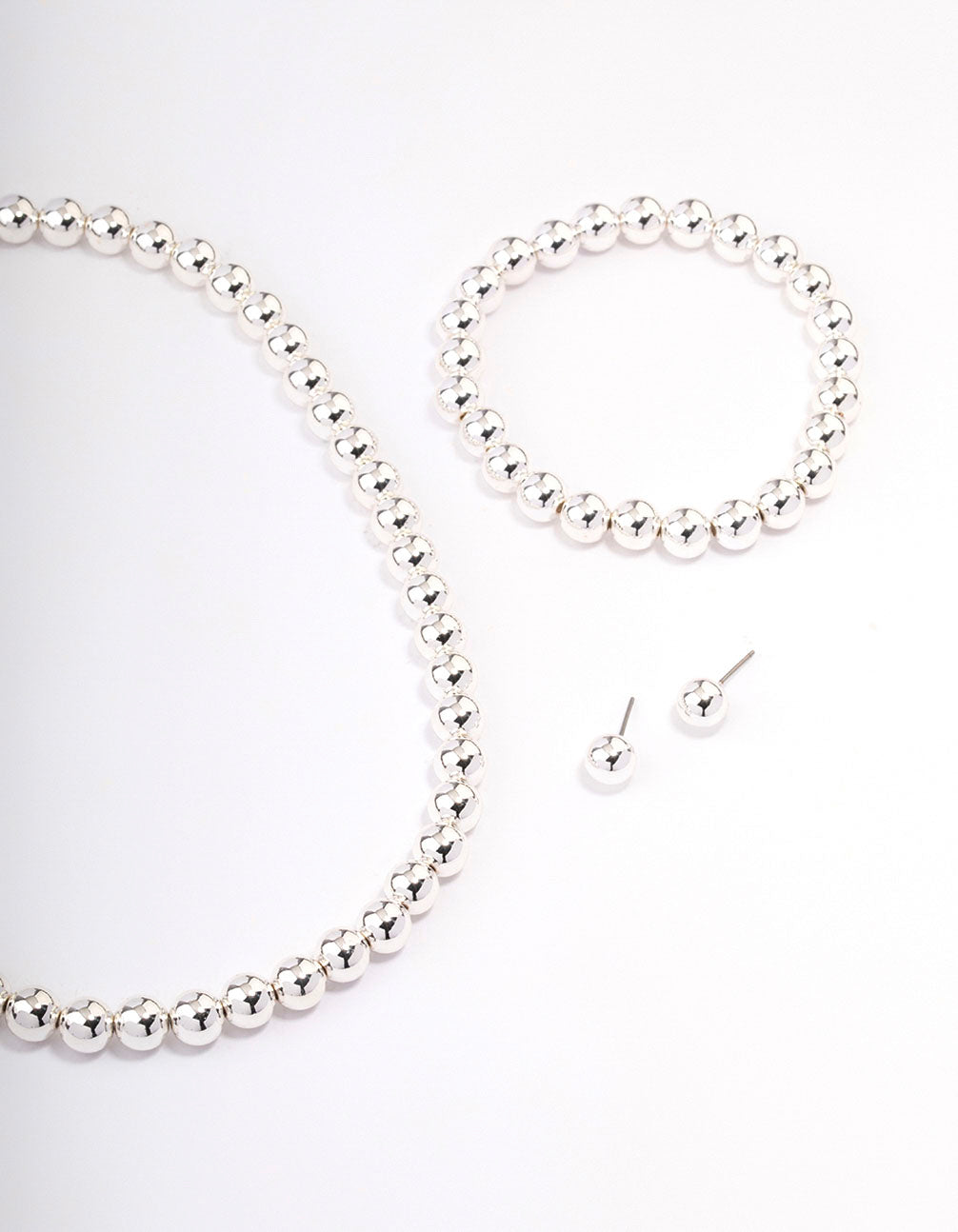 - This cohesive jewellery set contains a pair of silver ball earrings and matching pendant necklace and bracelet for a modern finish to your outfit.