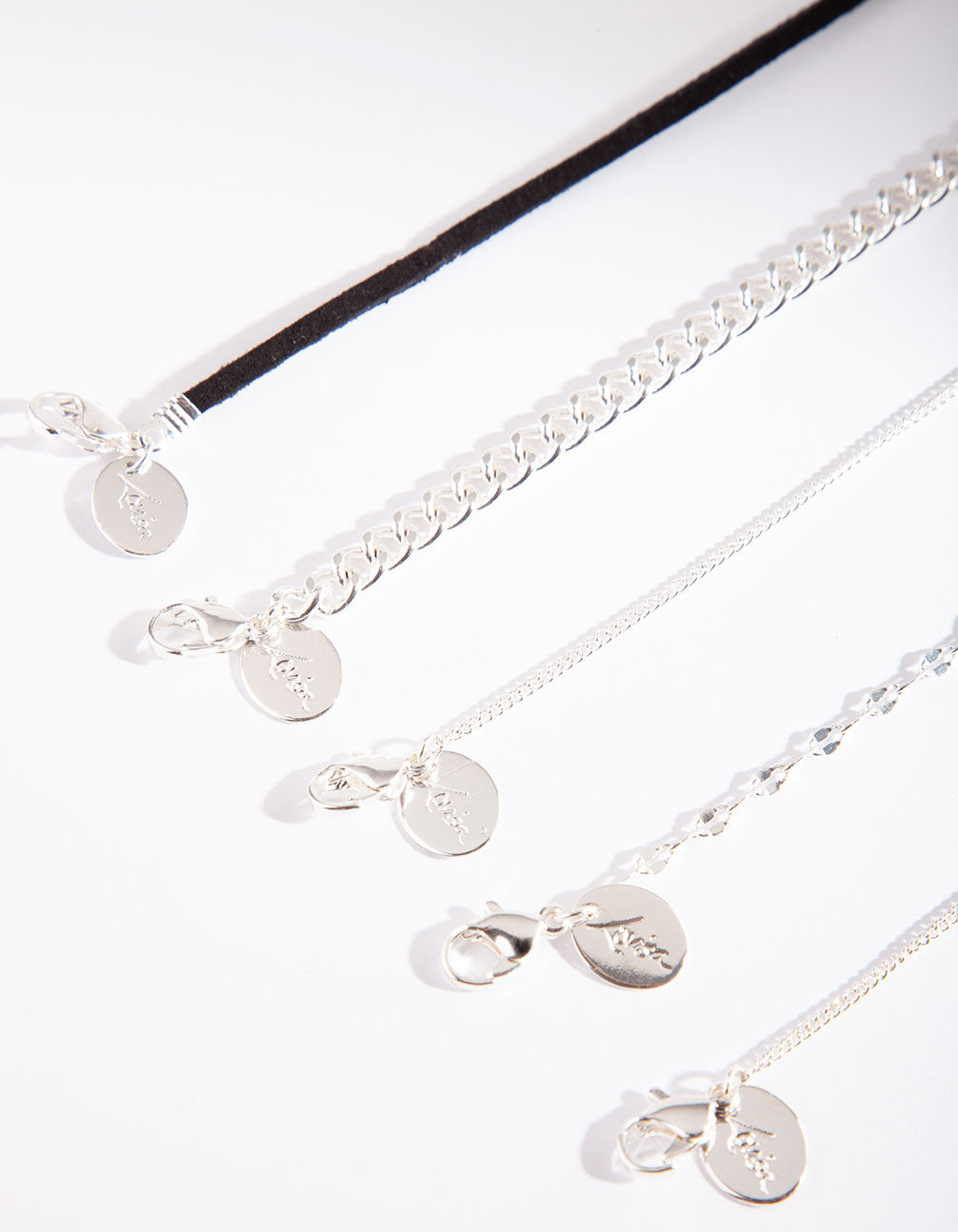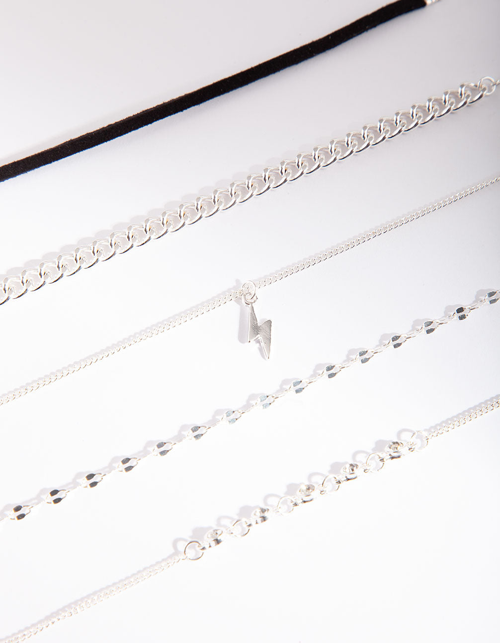 This essential piece is a go-to for events and daily wear. This hair accessory is a must to round-out your collection. This 4 braclet and anklet pack features thin and chunky chain designs with a lightning bolt charm.