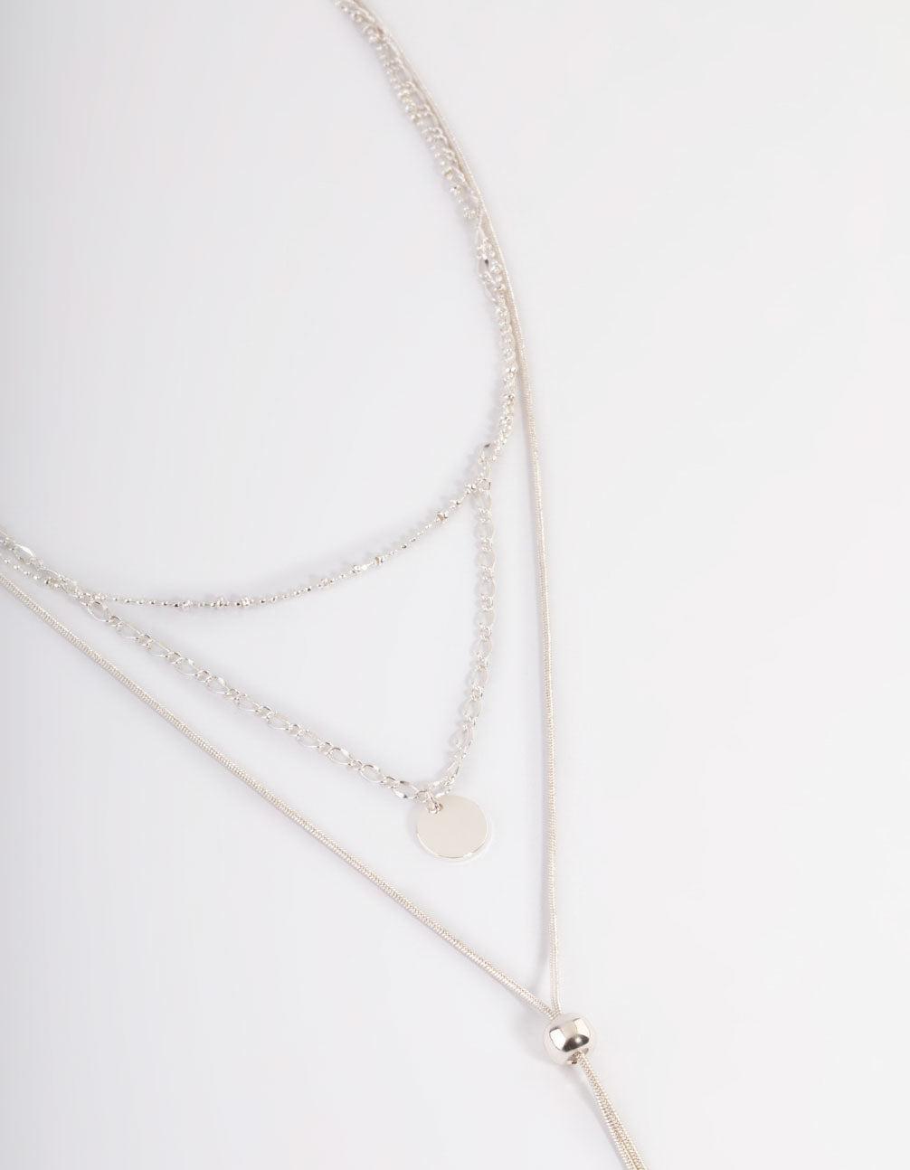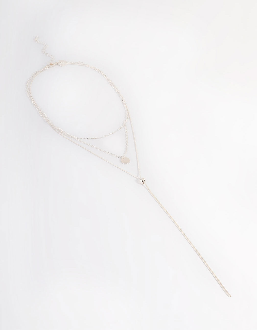 You can never have too many signature pieces! Style our silver-toned, Y-shaped disc pendant layered necklace with a pair of coin huggie earrings for a modern look.