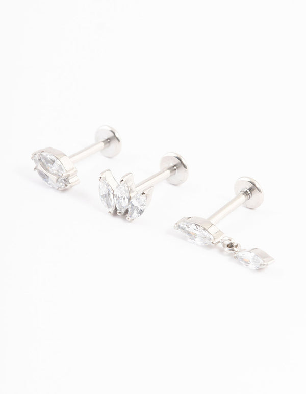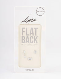 Embellished piercings are the latest trend to hit the runway! From versatile titanium studs, body piercings, to curated ear piercings — explore our range of threadless, titanium jewellery for a unique and personalised look. This pack feature 1 diamante leaf drop flat back, 1 diamante marquise trio flat back and 1 double marquise diamante flat back. Each flatback stud in this pack features a threadless back, for a secure fit and the threadless back also makes it easier for the flat back to be removed.