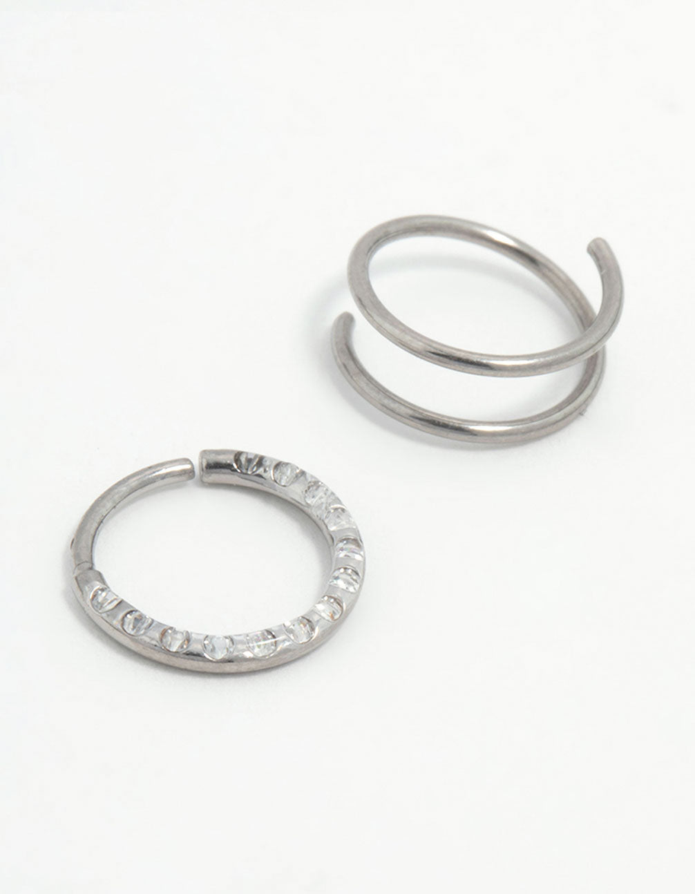 Titanium Cubic Zirconia & Spiral Nose Rings 2-Pack