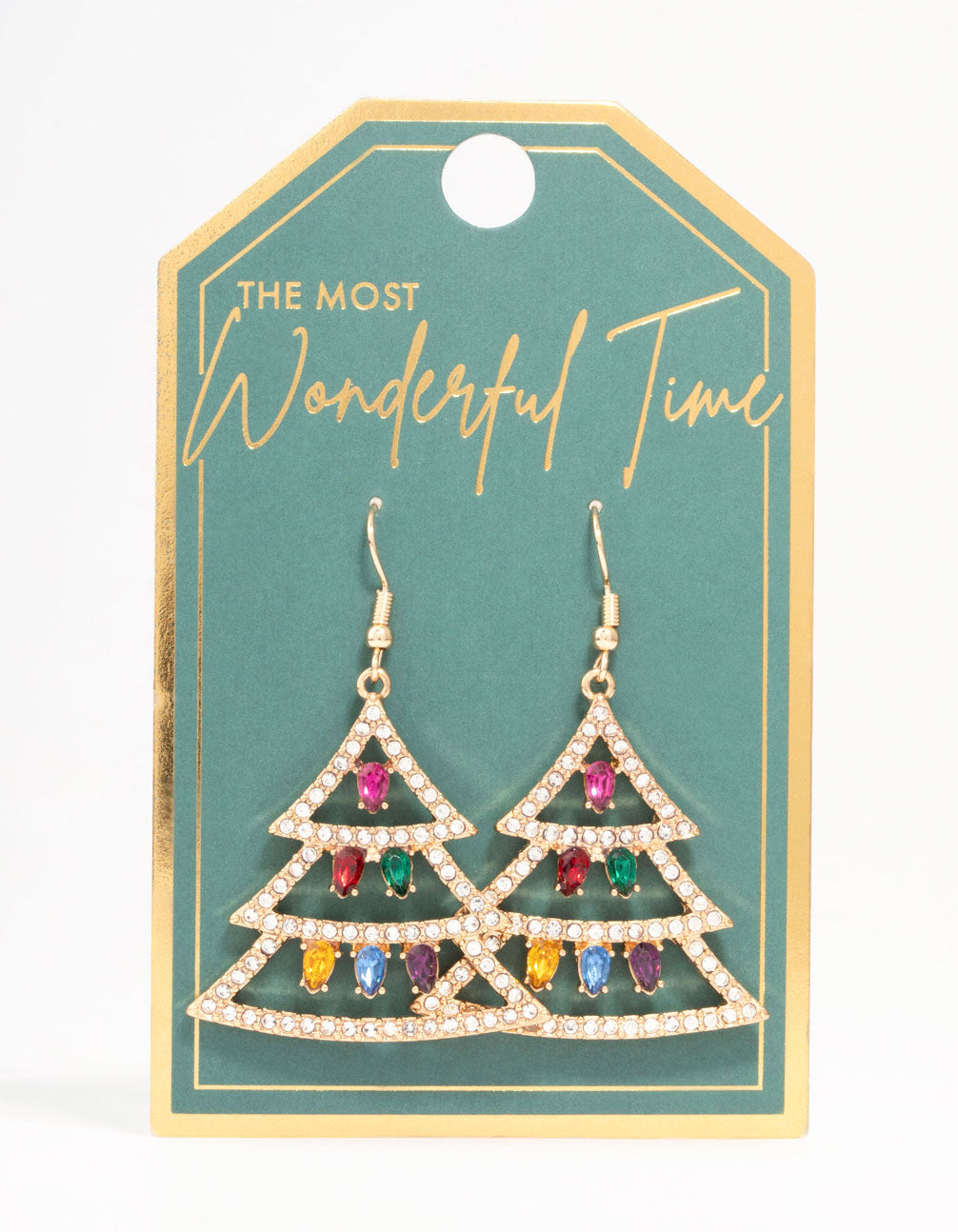 Gold Diamante Xmas Tree & Lights Drop Earrings