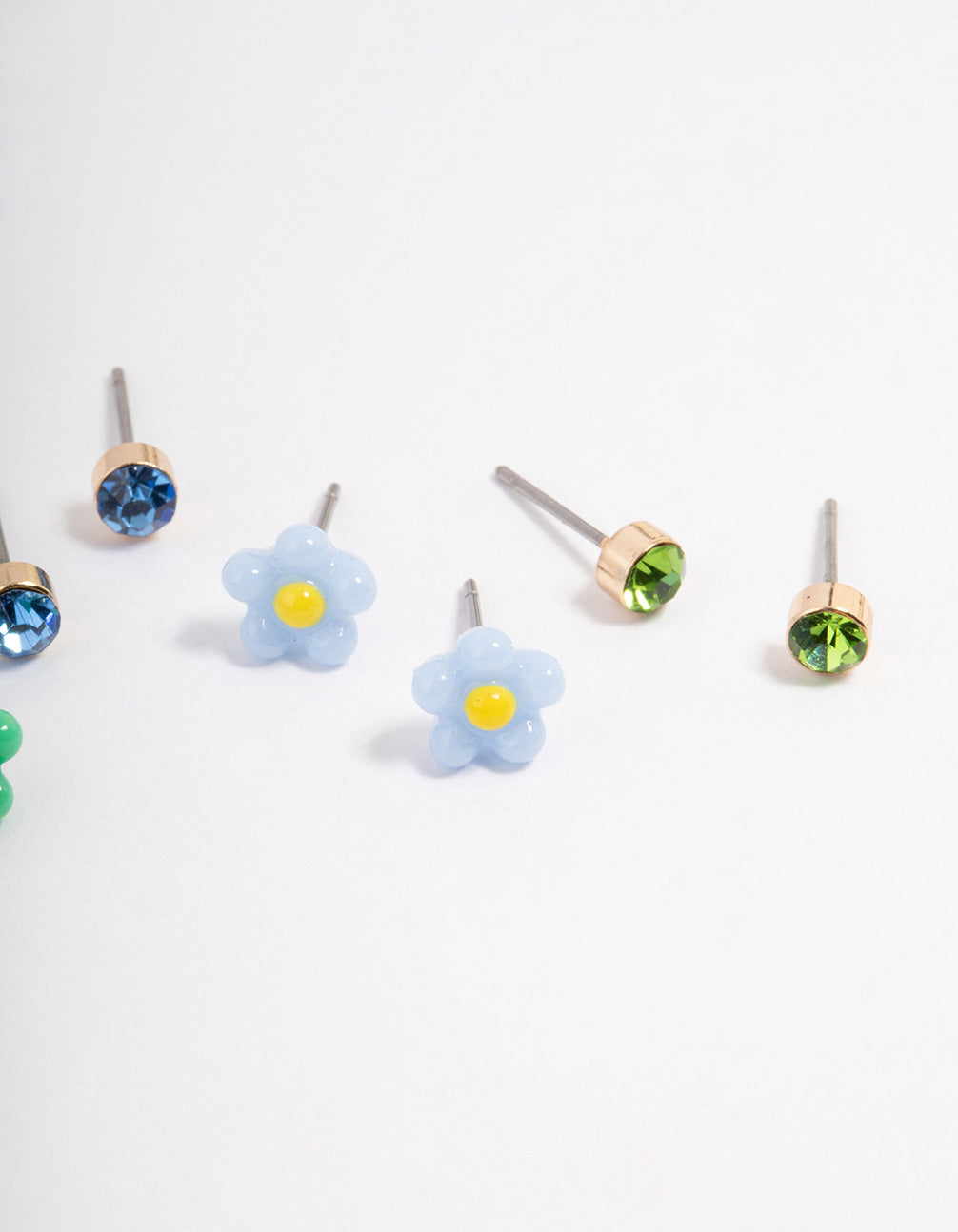 - This earring four-pack features a set of colourful studs, including a pair of green and blue floral earrings.