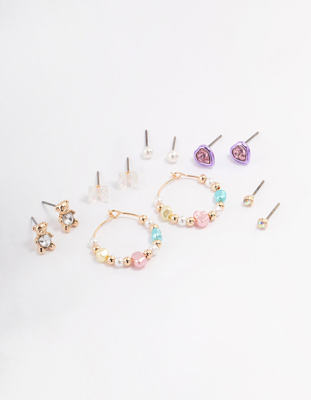 - This earring six-pack contains five pairs of colourful stud earrings and a pair of huggie hoops to match.