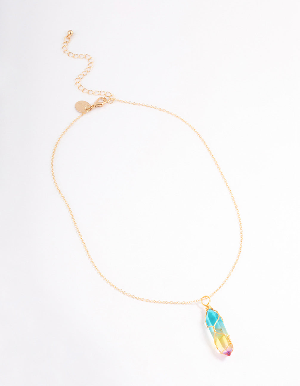 - This pendant necklace features a shard-shaped, rainbow coloured crystal with a gold, intricate casing for added detail.
