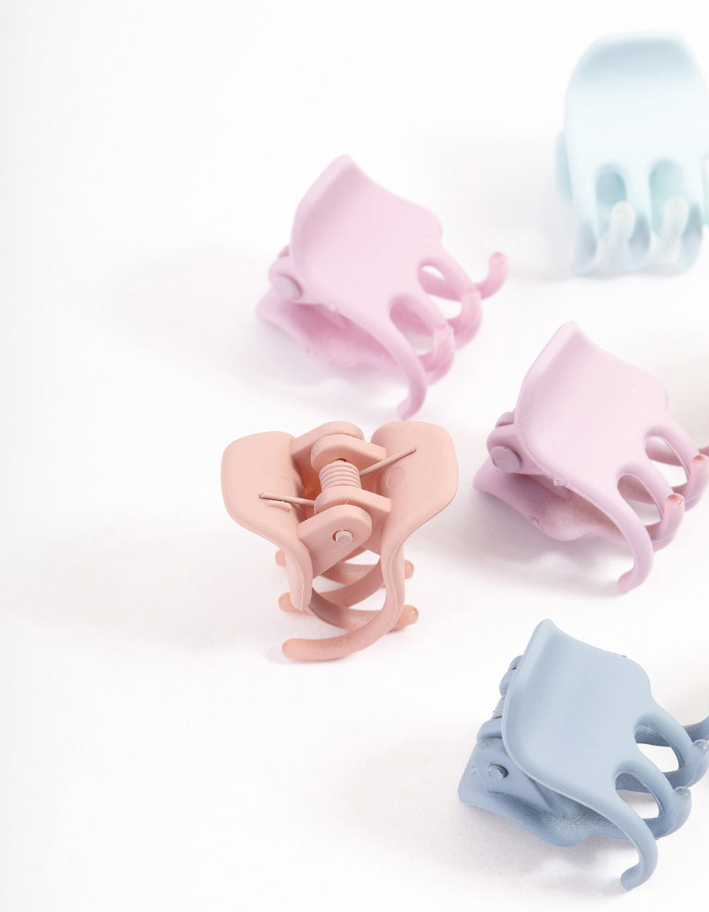 - This pouch of small hair claws contains eight individual pink and blue claw clips, perfect for versatile styling.