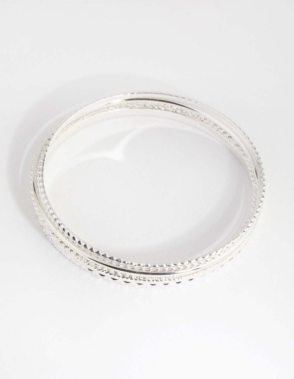Mix them, match them, stack them! Bangles are a great way to add a playful finishing touch to your look. This set is silver toned, and features four bangles with different textures to inspire intrigue. Stack them with other packs for maximum impact!