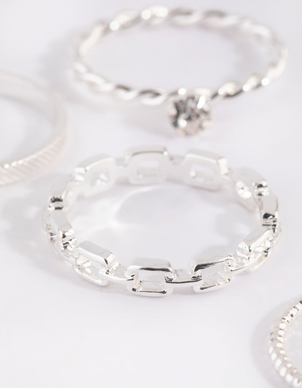 Boost your style with this set of 4 silver watch link rings. Mix, match, and stack them for a look that's effortlessly cool and always on-trend. Wear them solo or pile them on for a touch of modern elegance.