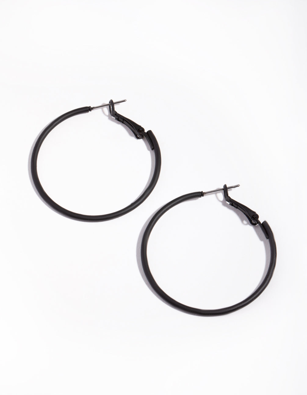 Change up your look with a funky pair of earrings. These hoops offer a spin on a classic hoop design as theyÕre matte black. They have a 60s mod vibe, but can also we worn to add some drama to your outfits!