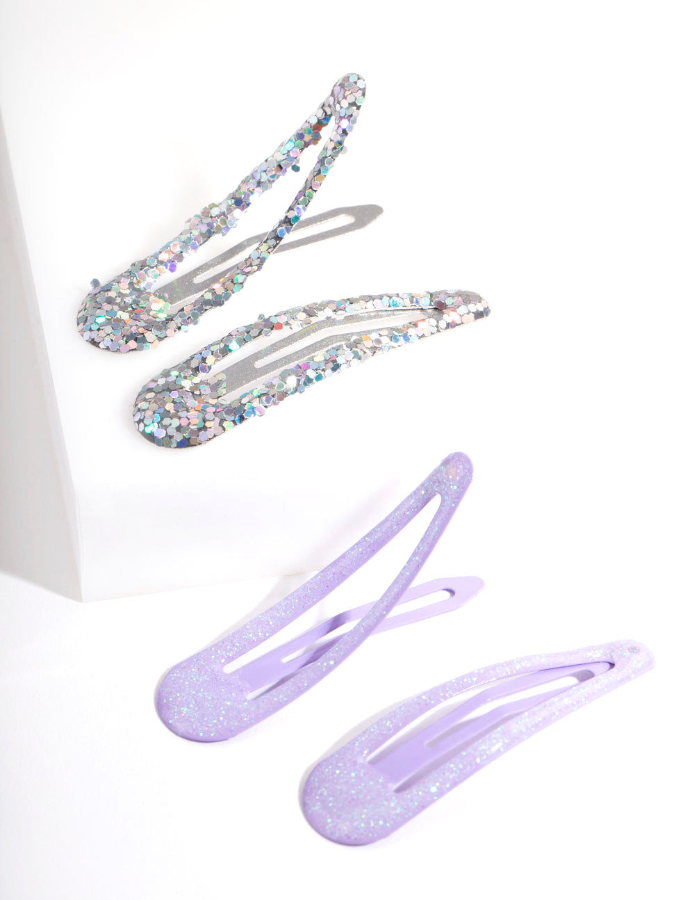 It's a snap! These adorable purple and glitter snap hair clips are the perfect colour block accessory to introduce pastels into your outfit. The glitter finish adds a fun and sparkly finish. Pair with crisp white cotton to make the colours pop!