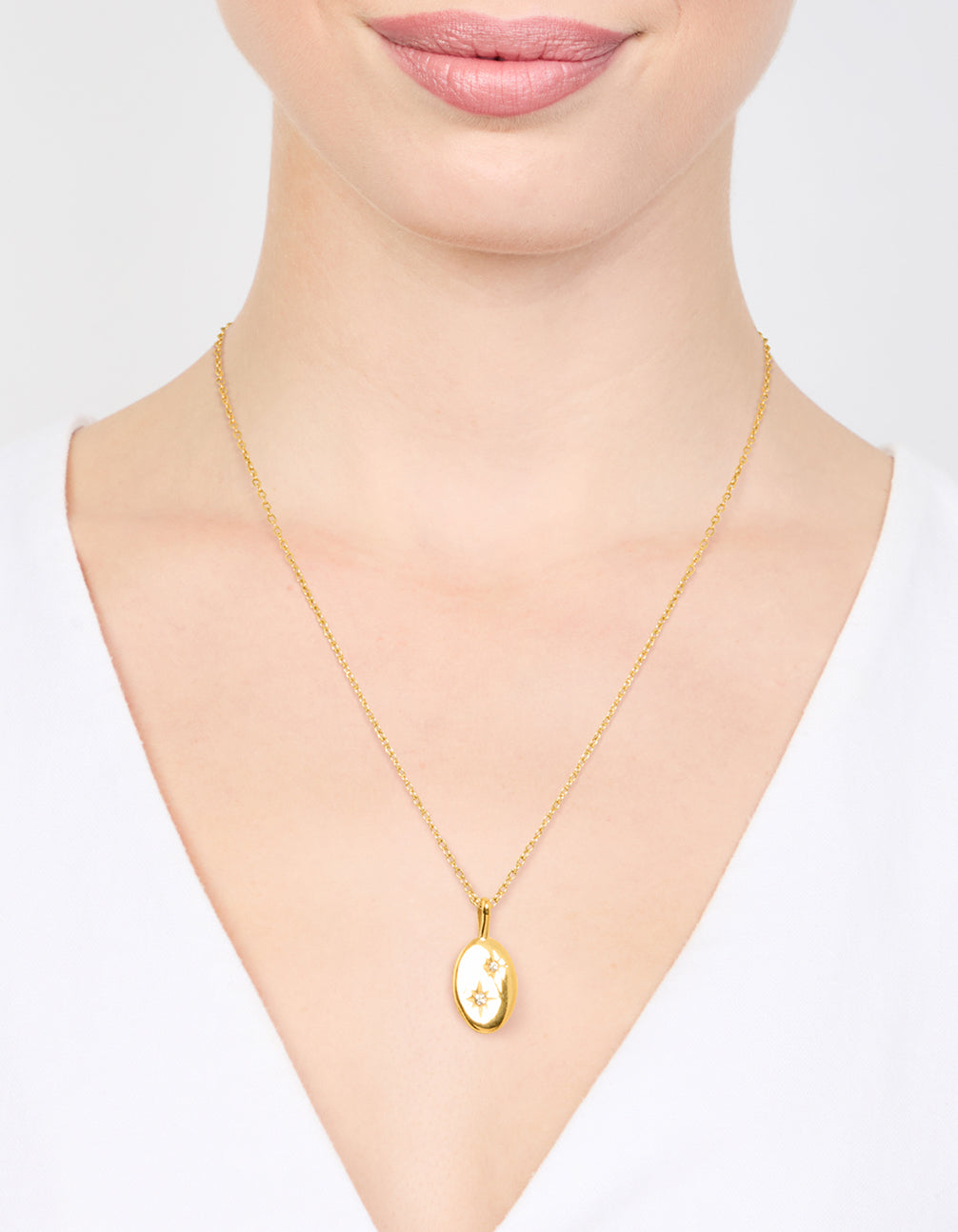 Add cosmic glam with this sleek pendant necklace. Made from durable, gold-plated stainless steel, it features an oval pendant with sparkly star motifs. Perfect for any adventure and any look.