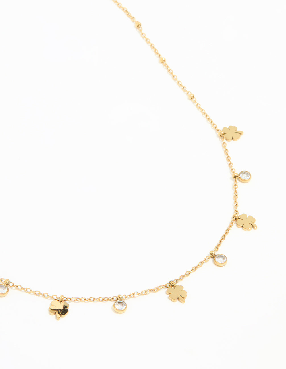 Add effortless elegance with this Waterproof Gold Plated Stainless Steel Cubic Zirconia Clover Necklace. This necklace features cubic zirconia crystals and clover charms, it's perfect for adding understated charm.