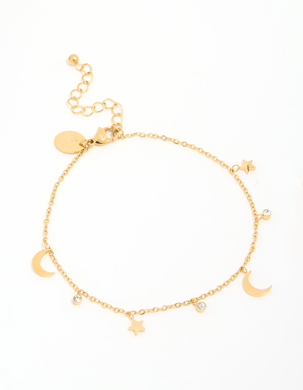 Shine bright with this Waterproof Gold Plated Stainless Steel Cubic Zirconia Moon & Star Anklet, a dreamy accessory that combines celestial charm with practical design. Featuring delicate moon and star shapes adorned with sparkling cubic zirconia crystals, this gold-plated stainless steel anklet is as durable as it is dazzling. Its waterproof finish ensures it's ready to accompany you everywhere, from beach days to city strolls or dinner dates. Lightweight and versatile, this anklet is ideal for layering with other jewellery or pairing with sandals, trainers, or heels. Whether you're rocking a casual outfit or a flowy summer dress, this anklet is perfect for adding a whimsical yet elegant touch to your look.