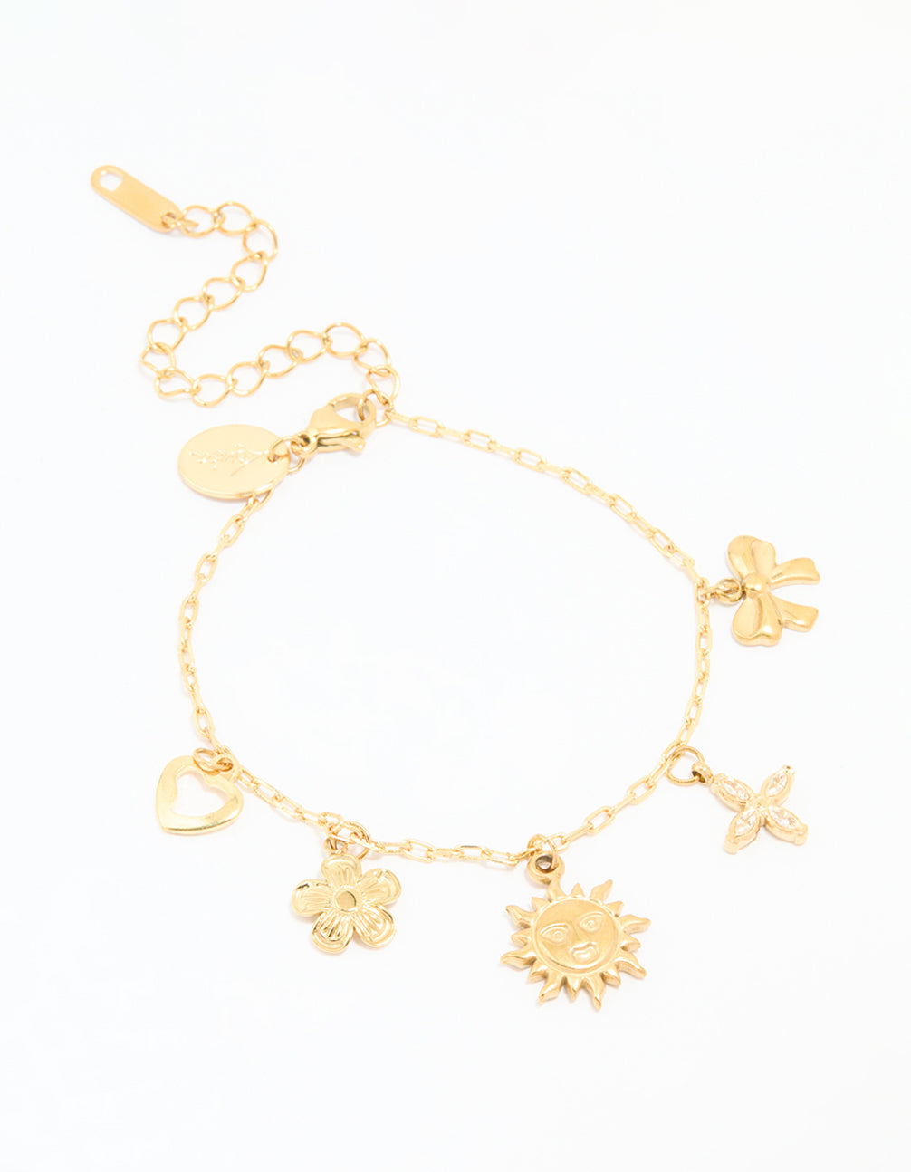 Brighten up your look with this Waterproof Gold Plated Stainless Steel Flower & Sun Charm Bracelet! This playful piece of jewellery combines delicate flower, heart, bow and sun-shaped charms, making it a dreamy addition to any outfit. Crafted from durable stainless steel with a luxurious gold plating, it's not just stylish but also built to last – perfect for those who live life on the go. Thanks to its fine waterproof design, you can wear this bracelet anywhere, from beach days to gym sessions, without a second thought. Pair it with casual jeans and a tee for a laid-back vibe or stack it with other bracelets to elevate your evening look. This versatile wristwear is a must-have accessory for anyone who loves practical yet chic style!