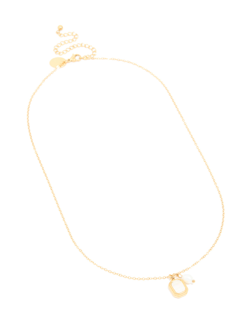 Waterproof Gold Plated Stainless Steel Pearl & Square Pendant Necklace Set