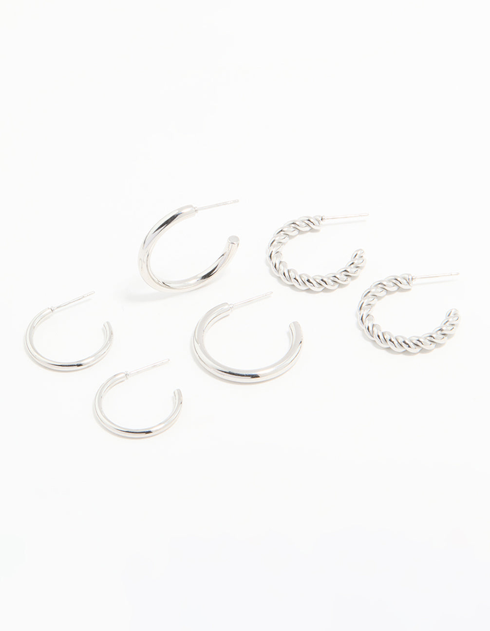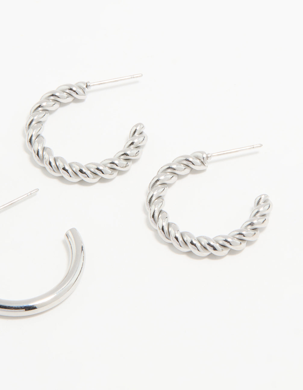 Waterproof Stainless Steel Twisted & Smooth Hoop Earrings 3-Pack