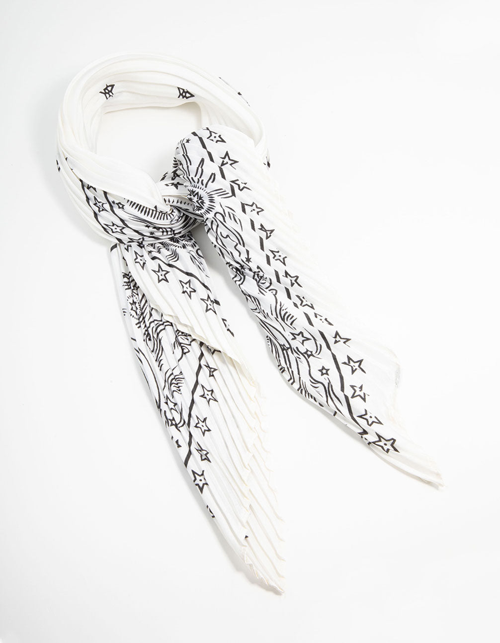 Add some cosmic flair with this white and black scarf! Featuring celestial motifs on plisse fabric, it's perfect for your hair, neck, or as a cute belt.