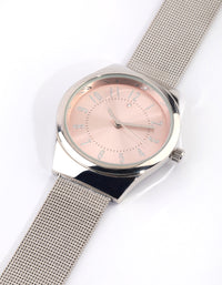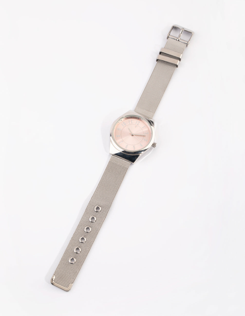 This classically designed silver tone watch features a metallic pink face with a mini diamante detail.