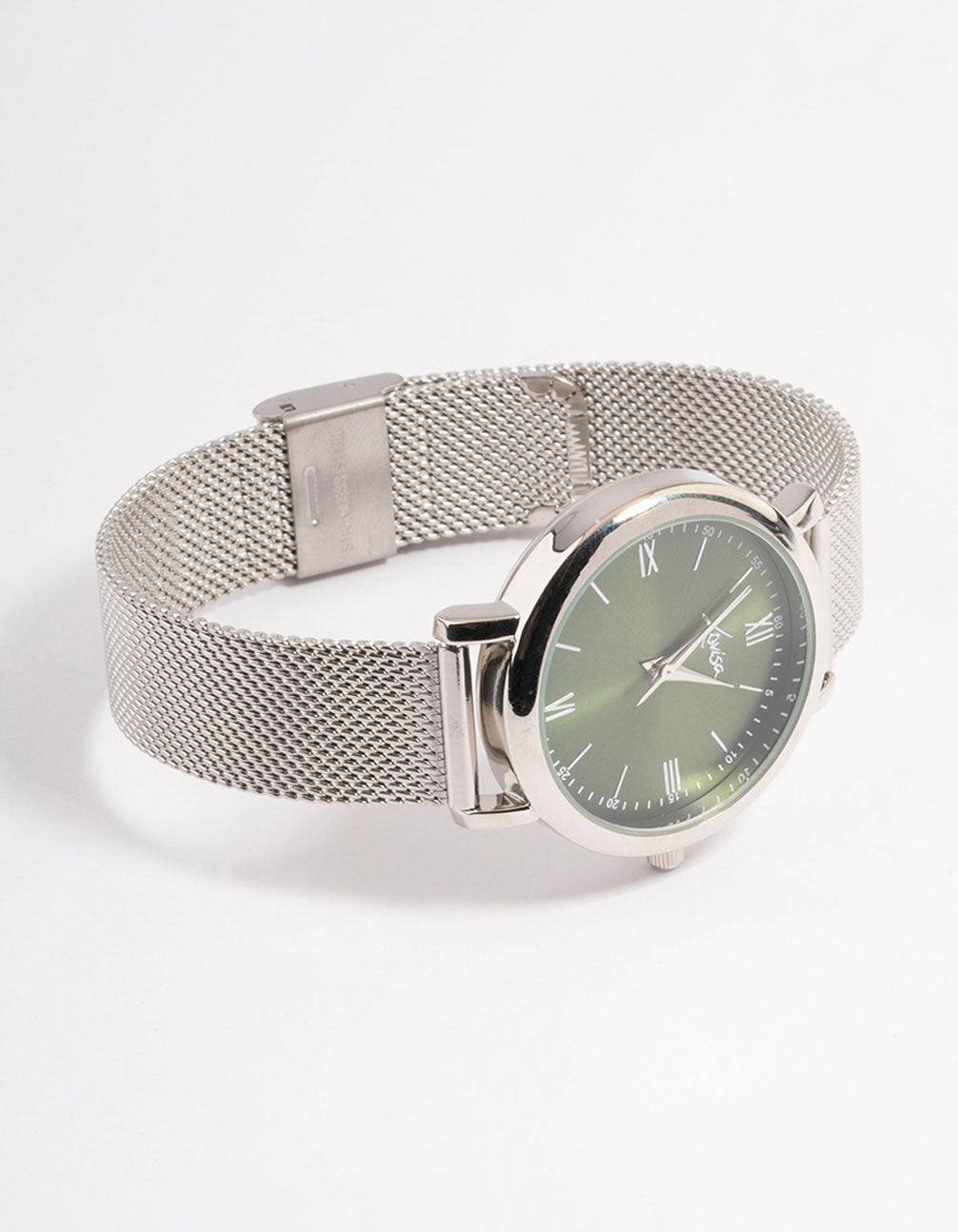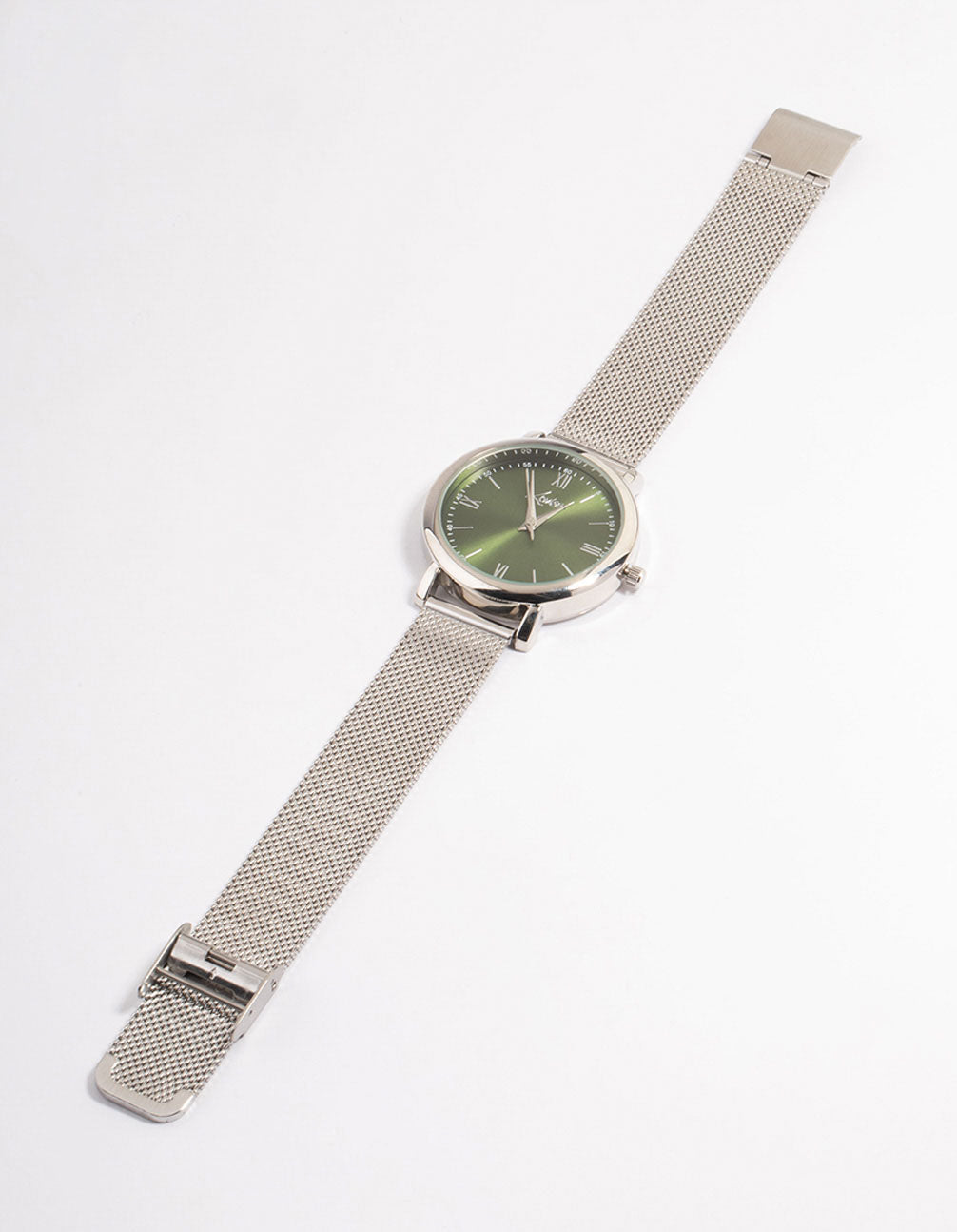 Watches are a great way to accessorise practically, while still adding interest to your outfit. This silver-toned watch features a simple green-coloured face and mesh strap for added detail.