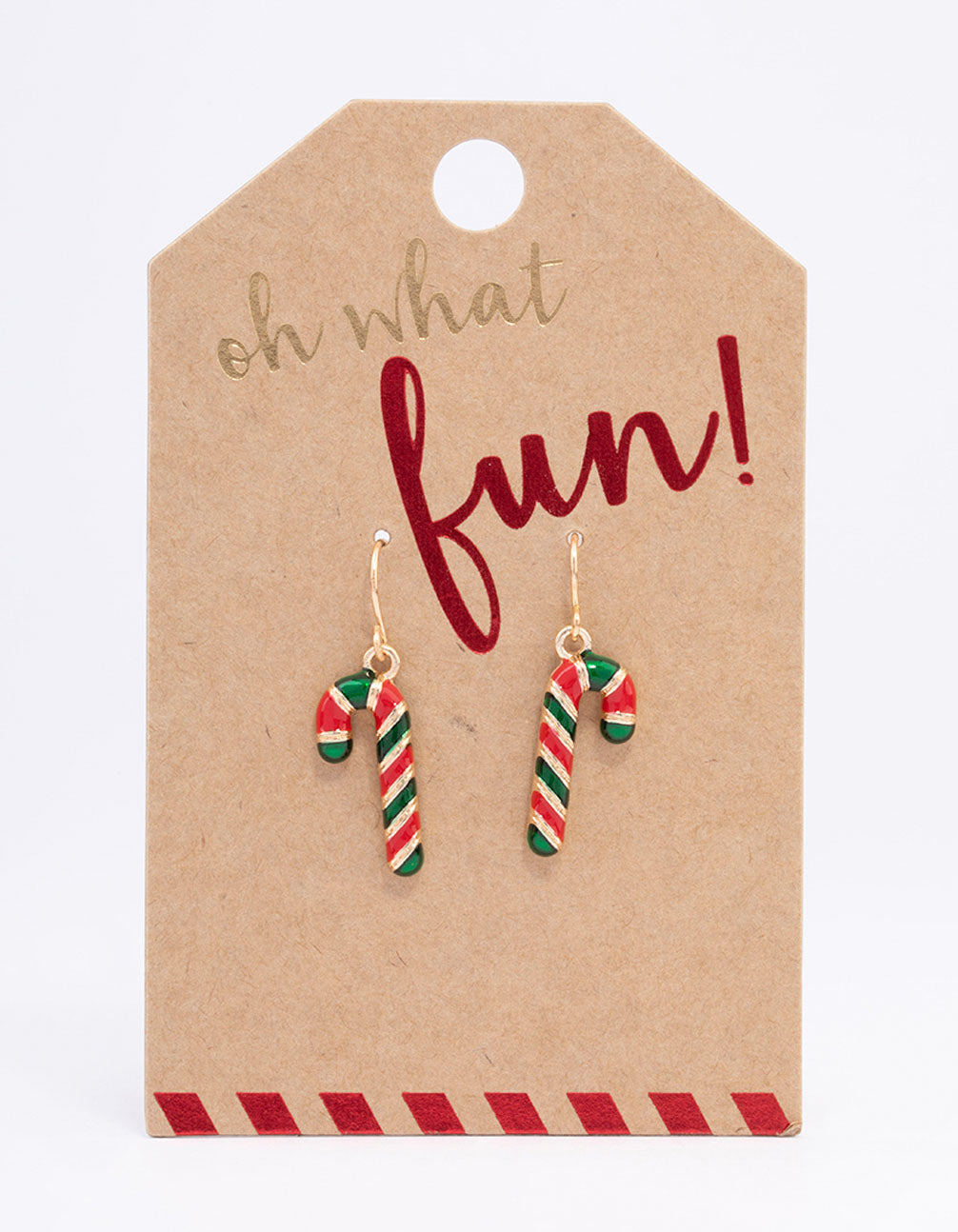 - These gold-toned drop earrings feature miniature candy canes designed with red and green stripes for a traditional feel.
