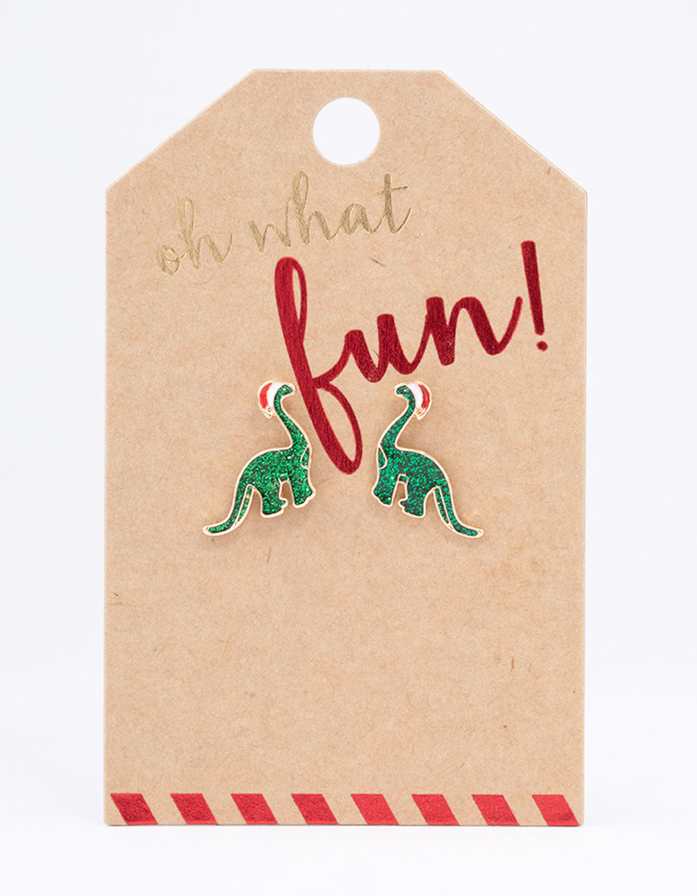 - These gold-toned, mini stud earrings feature two adorable dinosaurs wearing Santa hats for a playful finish to your stack.