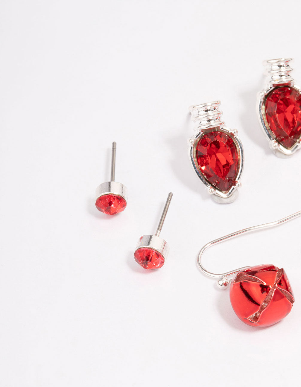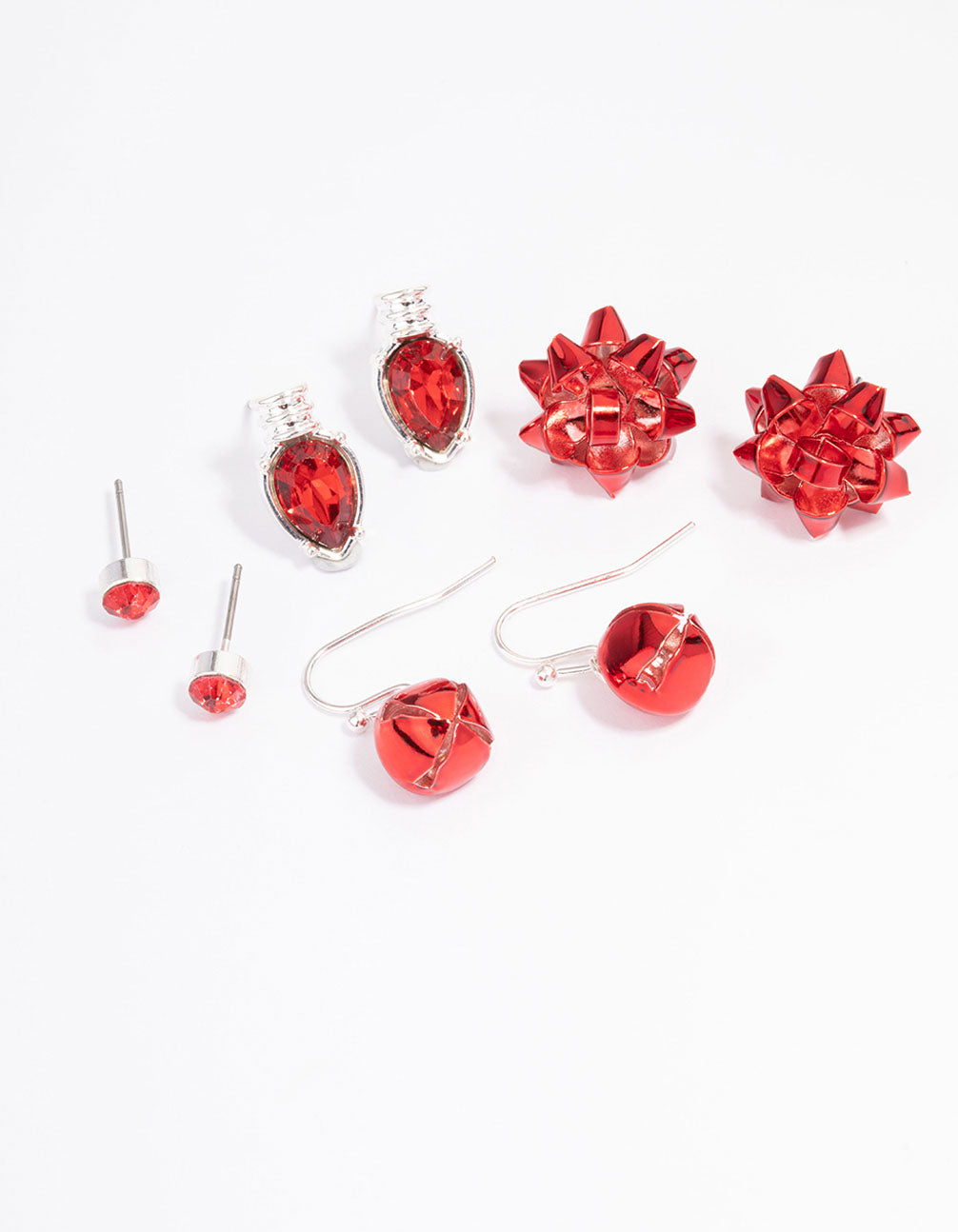 • This earring pack contains four sets of earrings including three pairs of red, festive studs and a set of jingle bell drop earrings. Style them for a simple pop of red, or stack them together for a curated ear stack.