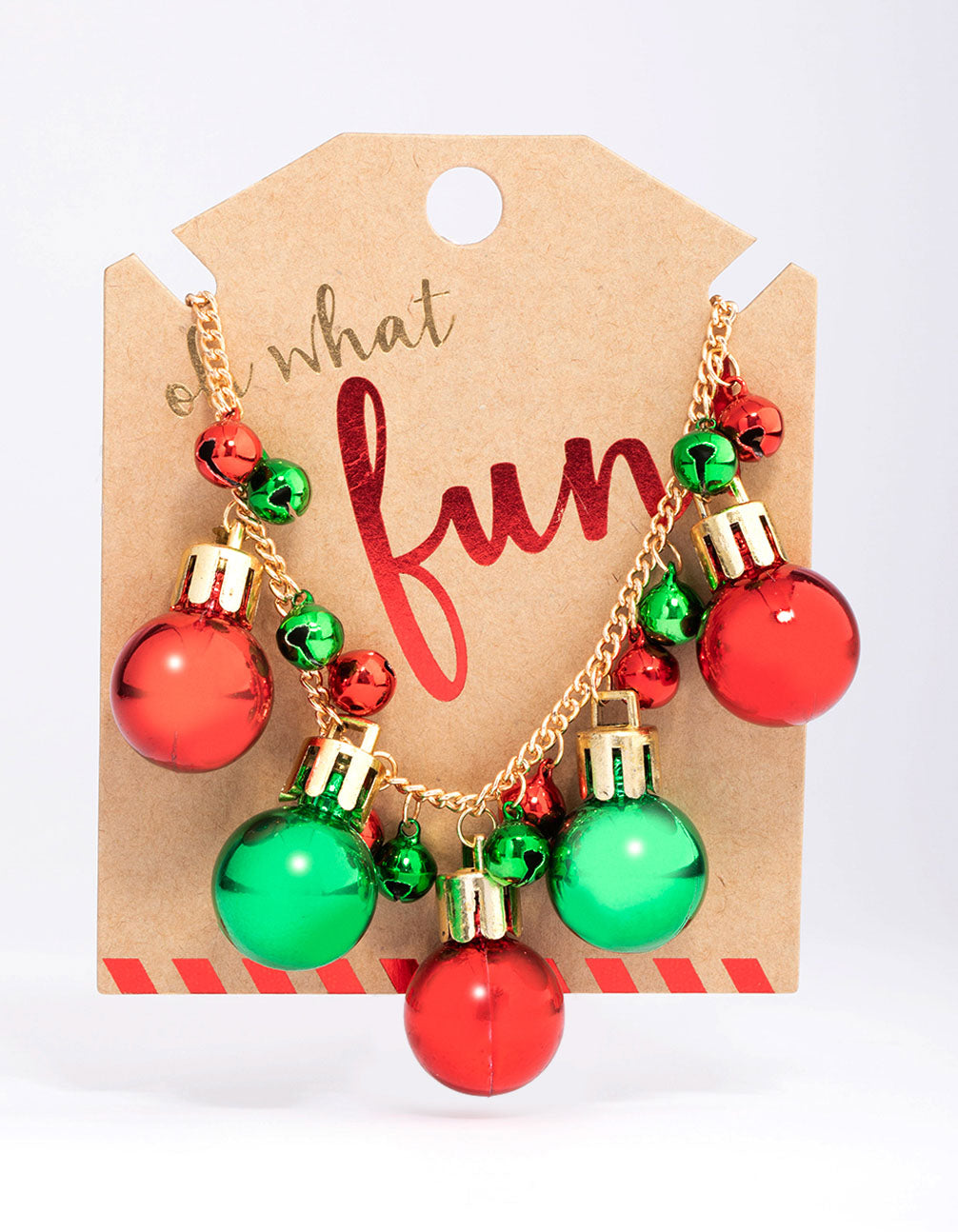 - This necklace features a thin gold chain with a collection of green and red baubles for an embellished festive look.