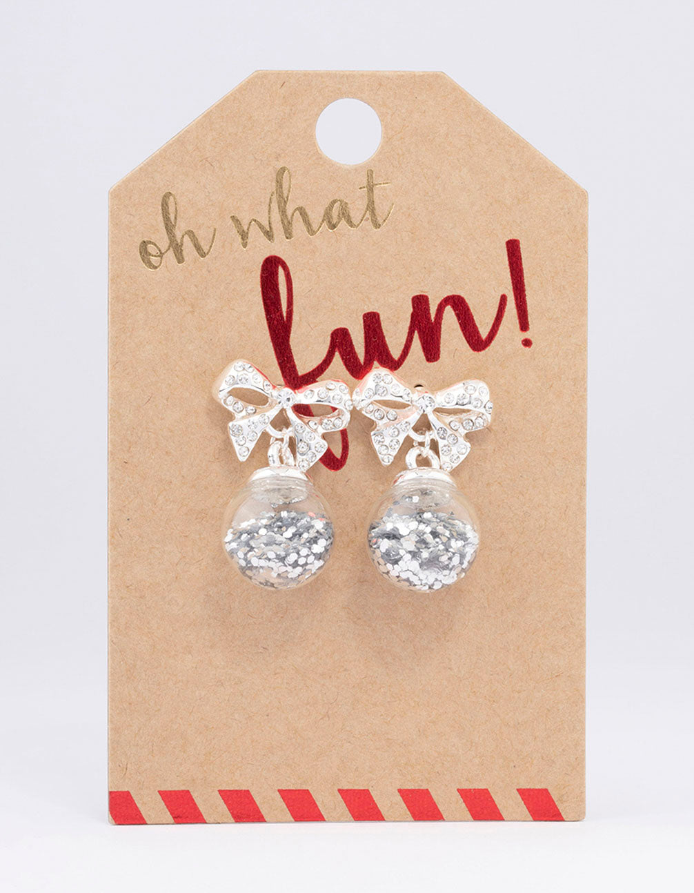 - These silver drop earrings feature mini, sparkly baubles filled with silver glitter and adorned with cute ribbons on the top.
